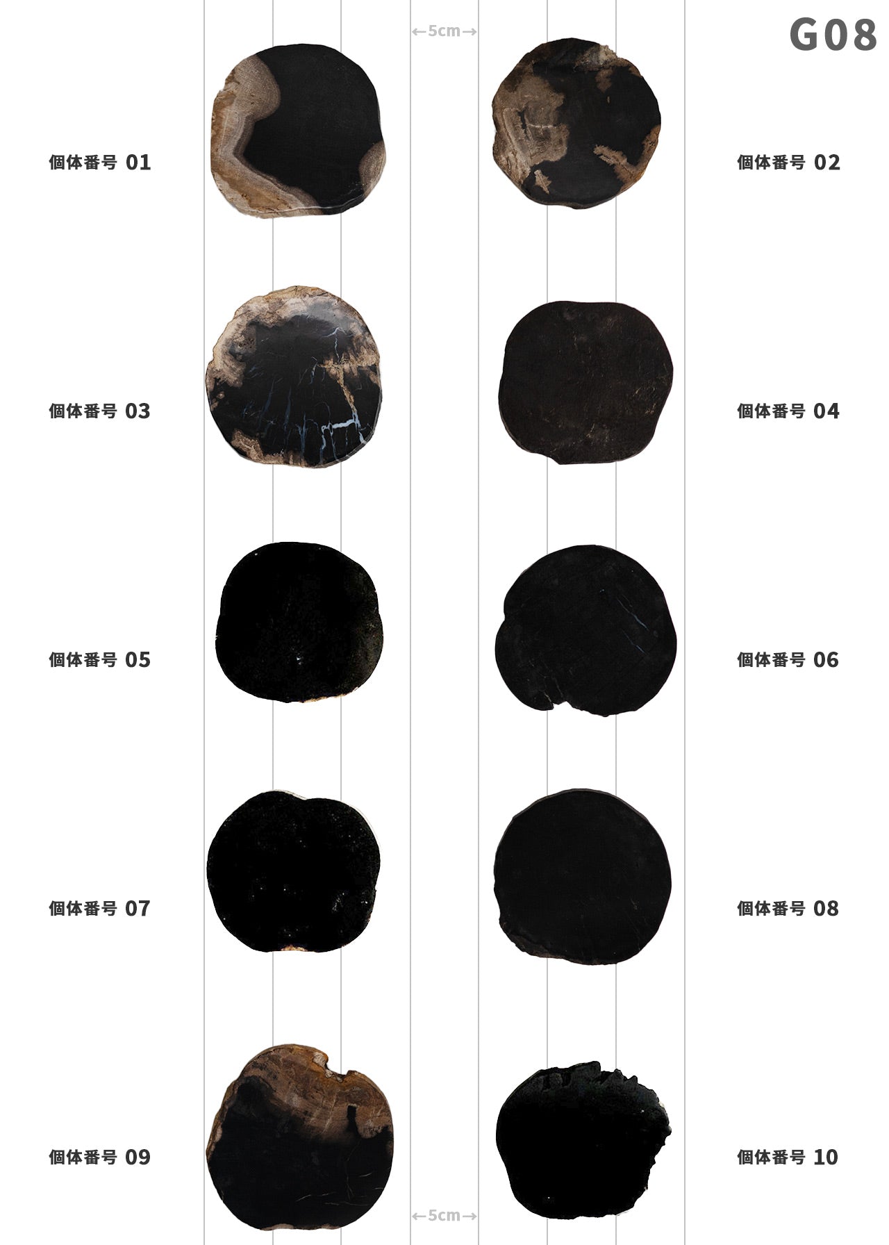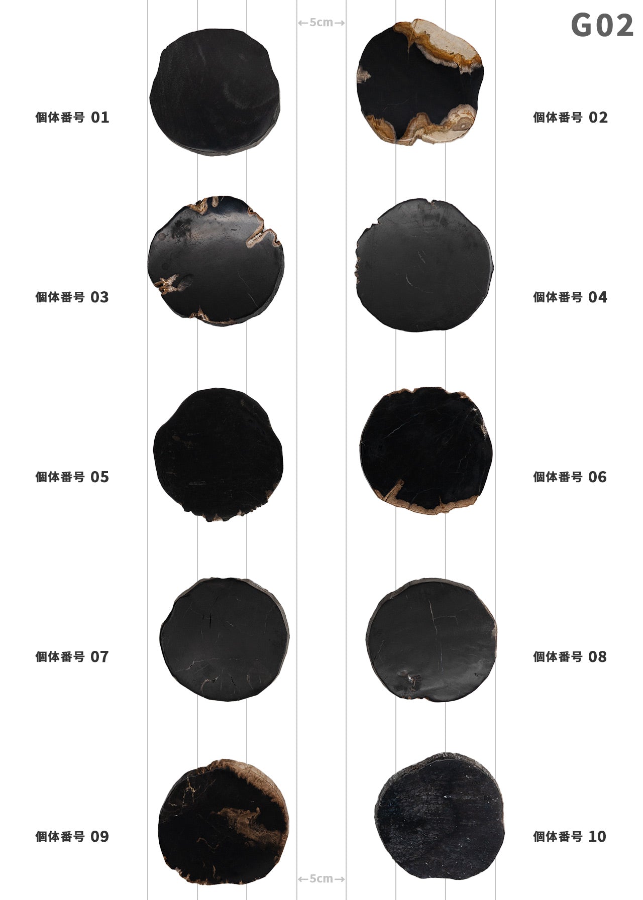 WOOD COASTERはブラックとナチュラルと分けて販売しておりますが、比較的黒っぽい個体をブラックとして撮り揃えております。厚さは 9mm~1cm前後で厚みにバラつきがあり、削り出したままの断面からは鉱物らしさを感じます。