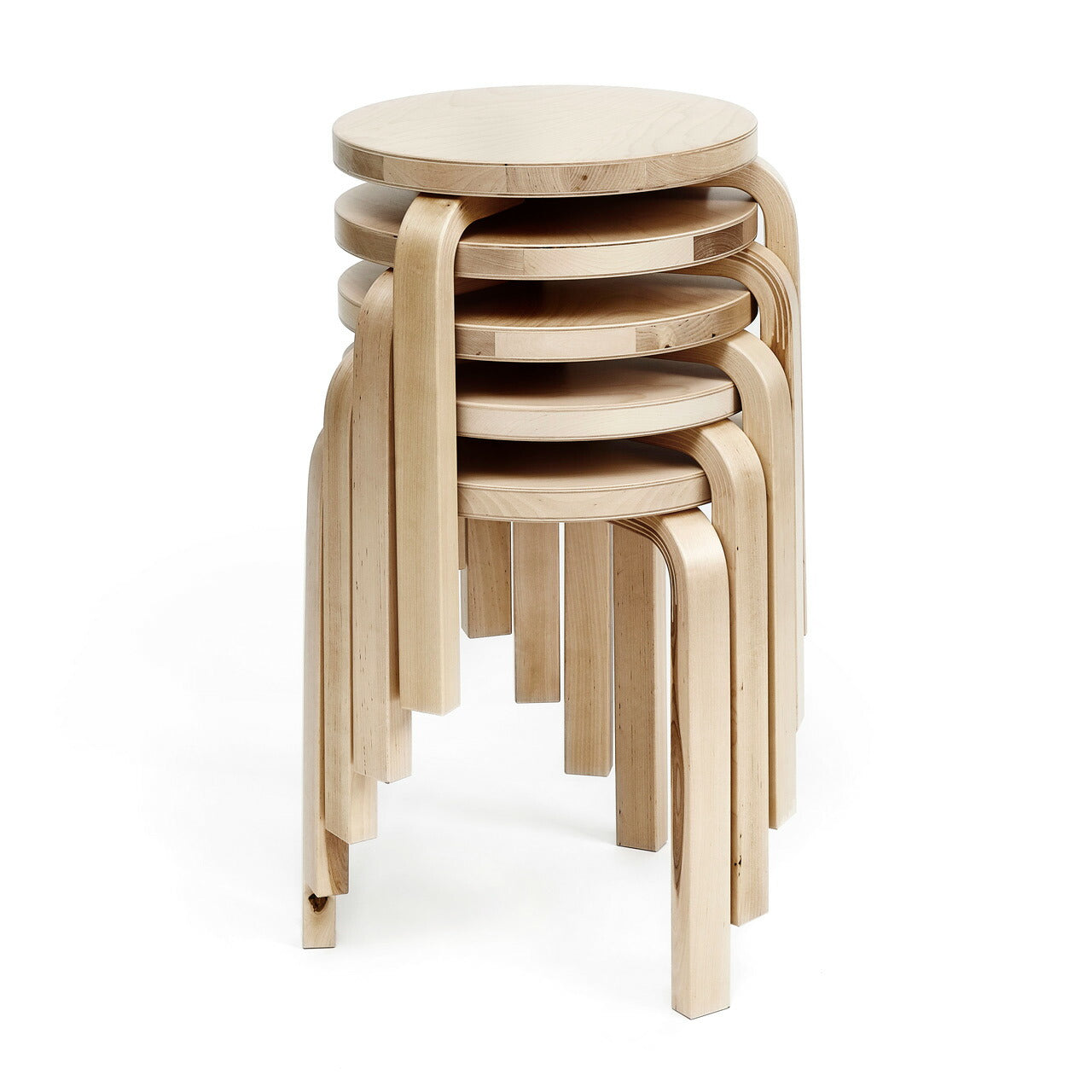 当時フィンランドでは、唯一の資源である木材の新たな用途を開発し輸出することで、経済成長を促進することが求められていました。アアルトは3年の年月をかけて、木材を使用した量産可能な家具を作るために「L-leg」という独自の曲木の製法を開発します。この技術が使われたひとつであるスツール60は、硬く分厚い木材をそのまま曲げることで金属のような強度が実現し、経年変化にも強い作りになっています。