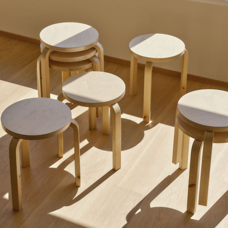 1933年、アルヴァ・アアルトがデザインしたスツール60。当時アアルトが設計を担当した図書館で使用するために作られました。講堂でずらっと並べても景観の邪魔にならない均等な見た目と、使わない時には部屋の隅に重ねて置いて置くことができる圧倒的にシンプルで機能的なスツールです。当時から90年近く経ちましたが、環境と場所を選ばず、先進的でどんな時代にも好まれるデザインが大ベストセラーとなり、今やなんと世界中で800万脚以上が製造されている逸品となりました。