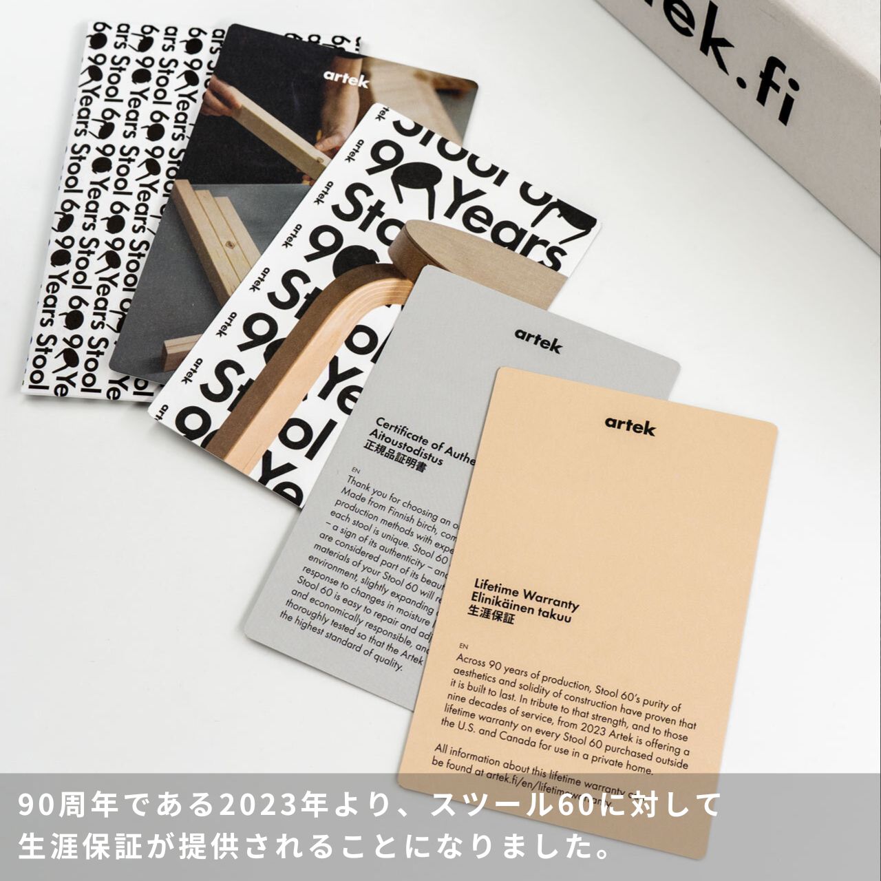 90周年である2023年より、スツール60に対して生涯保証が提供されることになりました。 生涯保証は、製品の確かな品質と耐久性を証明するものです。生涯保証は2023年1月以降、個人仕様のための新品のスツール60全てに適用されます。 スツール60の箱に生涯保証についてのカードが同封されているのでご確認ください。