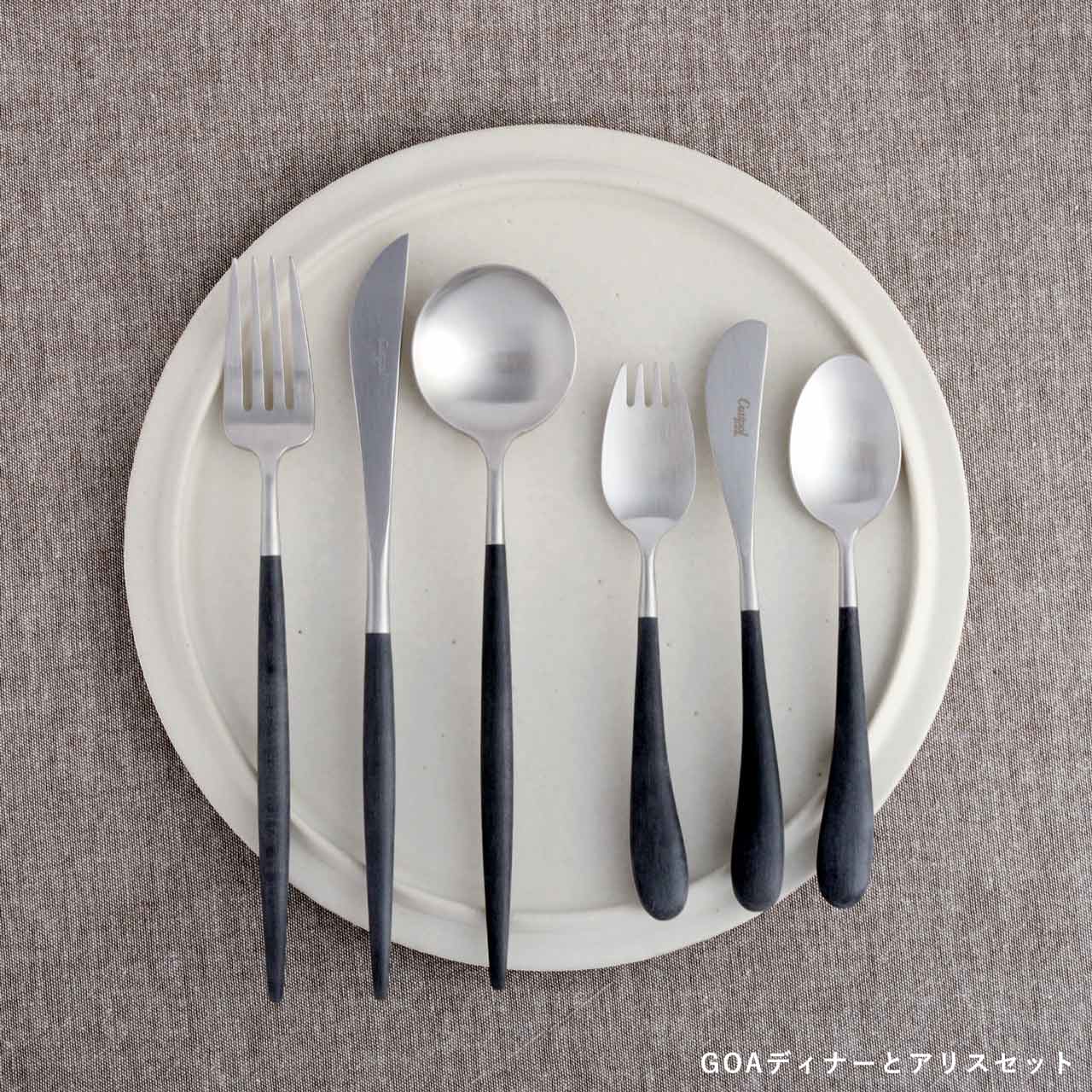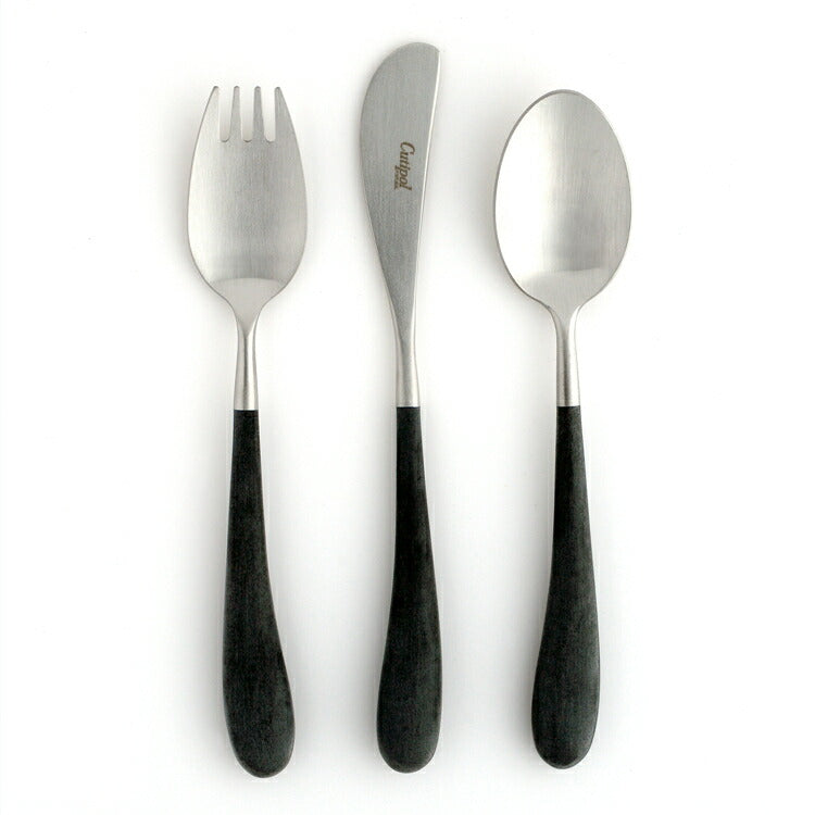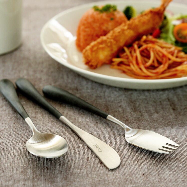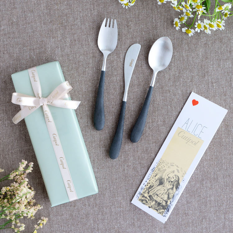洗練されたフォルムで世界中で人気の高いポルトガルのカトラリーブランド「Cutipol」。1本1本ハンドメイドで仕上げられる作品とも言えるその美しいデザイン、人間工学に基づき設計された持ちやすさ、使いやすさをともなった機能的なカトラリーです。 クチポールブランド初の子ども用カトラリーセット「ALICE SET」は、5〜6歳程度のお子様から使用し始めることを想定した、ディナーフォーク/ナイフ/スプーンの3本セットです。ナイフは子供に持たせても危なくないよう鋭くなく、オムレツやハンバーグをカットしたり、バターやジャムを塗るのに適しています。持ち手の左右非対称のデザインはテーブルマナーを覚えはじめた子どもが左手のフォークと右手のナイフを間違えないように配慮されたものです。食事をする中で自然にテーブルマナーを身につけることができますよ。クチポールの代表シリーズGOAシリーズと同じ質感・色合いなので、家族で揃えると食卓に統一感が出て素敵ですね。 こども用のカトラリーですが、従来の製品同様、高品質なものなので子どもが成長した後もデザートスプーンやバターナイフとして長くお使いいただけます。専用のボックスに入れ、クチポールロゴ入りリボンでラッピングをしてお届けしますので、入園や入学、七五三など節目でのプレゼントにもぴったりです。 ■商品名 クチポール ALICE ナイフ・フォーク・スプーン3本セット ブラック/マットシルバー リボンラッピング済み ■サイズ(約) ナイフ 17.4cm、フォーク 長さ16.1cm、スプーン 長さ16.0cm 重さ(約):ナイフ 23g、フォーク 24g、スプーン 28g ※ハンドメイドのため仕上げなど個体差があります。 ※専用ボックス入り(輸送中の損傷を防ぐために中は個包装しております) ■素材 18-10ステンレス、アセタール樹脂(25%ガラス繊維強化) 食洗機の使用可 ※高温洗浄は不可。手洗いをおすすめします。 ■製造 クチポール(キュティポール) ※当店はCutipolの日本正規取扱店です 生産国:ポルトガル ■手提げ袋は別売です
