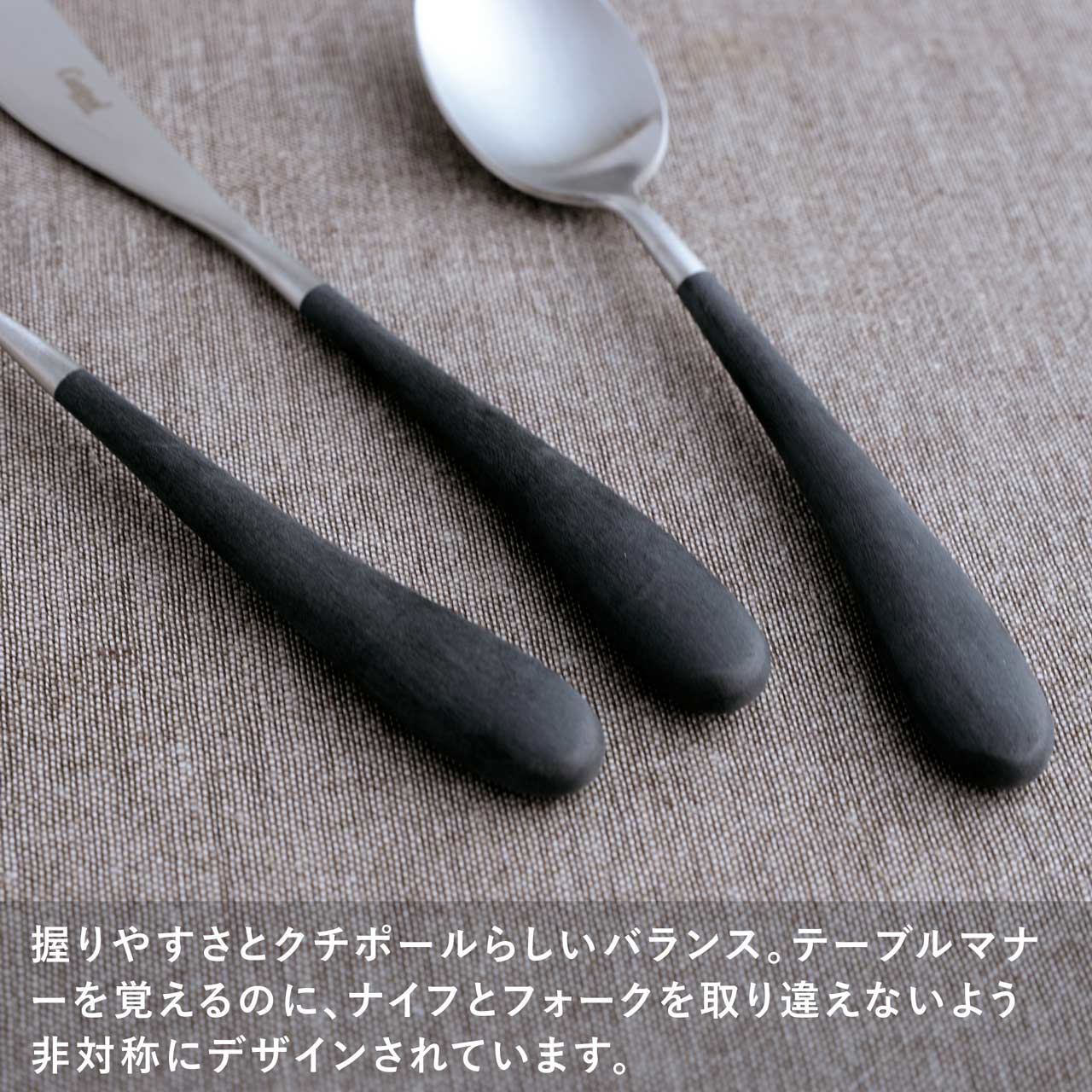 握りやすさとクチポールらしいバランス。テーブルマナーを覚えるのに、ナイフとフォークを取り間違えないよう非対称にデザインされています。