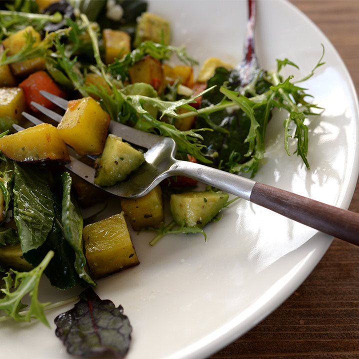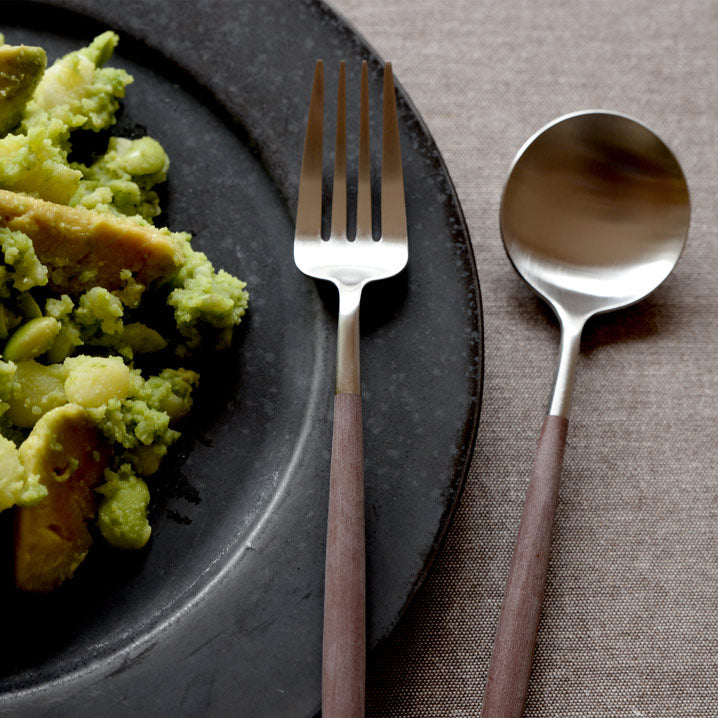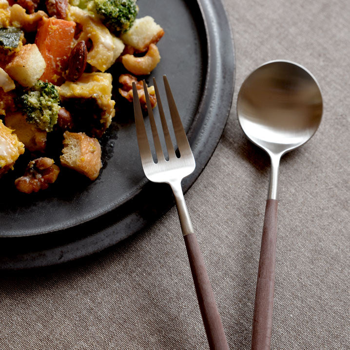 洗練されたフォルムで世界中で人気の高いポルトガルのカトラリーブランド「Cutipol」。1本1本ハンドメイドで仕上げられる作品とも言えるその美しいデザイン、人間工学に基づき設計された持ちやすさ、使いやすさをともなった機能的なカトラリーです。 細身の持ち手とステンレスとのコントラストでデザインされたGOAシリーズはクチポールを代表するシリーズ。適度なヘッドの重み、木製のようですべりにくいさらっとしたアセタール樹脂(25%ガラス繊維強化)の持ち手が絶妙なバランスで設計されており、誰もが使いやすさを実感できます。木のような優しい質感からカフェで使われているイメージもありますが、マットなシルバーと相まって和食器でも雰囲気良くまとまります。大切な人へのギフトに、使用機会の多いディナーフォークとスプーンをペアのカトラリーセットでご用意しました。 クチポールロゴ入りのギフトボックスにロゴ入りリボンをかけてお届け。クチポール正規品の証となる日本語版のリーフレットも付属しており、クチポール社のメッセージとともに製造風景などが紹介されています。また、当店オリジナルショッパー(紙袋)が付属しておりますのでそのままプレゼントとしてお渡しいただけます。 ■商品名 クチポール GOAディナーフォーク・スプーン 4本セット ブラウン/マットシルバー 手提げつき ■付属品 当店オリジナルショッパー(紙袋) ※クチポールの紙袋ではございません。 ■サイズ(約) 長さ:フォーク 21.7cm、スプーン 21.1cm 重さ:フォーク 29g、スプーン 37g ※ハンドメイドのため仕上げなど個体差があります。 化粧箱サイズ 幅9cm × 奥行25cm × 高さ3.5cm ■素材 18-10ステンレス、アセタール樹脂(25%ガラス繊維強化) 食洗機の使用可 ※高温洗浄は不可。手洗いをおすすめします。 ■製造 クチポール(キュティポール) ※当店はCutipolの日本正規取扱店です 生産国:ポルトガル