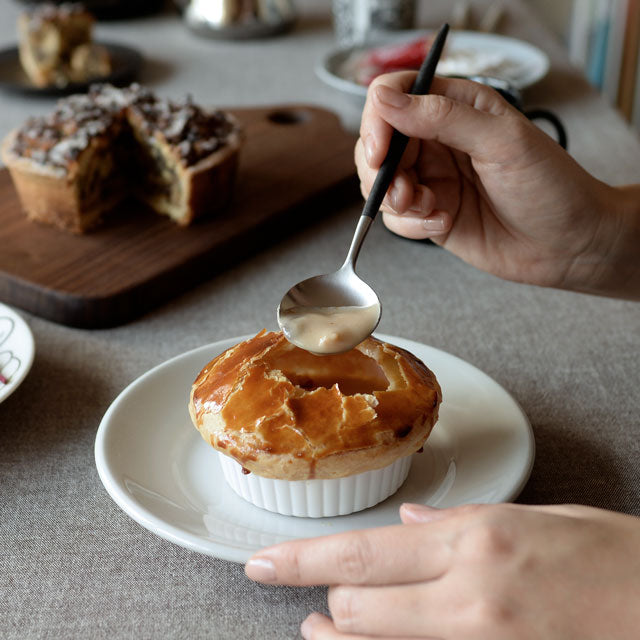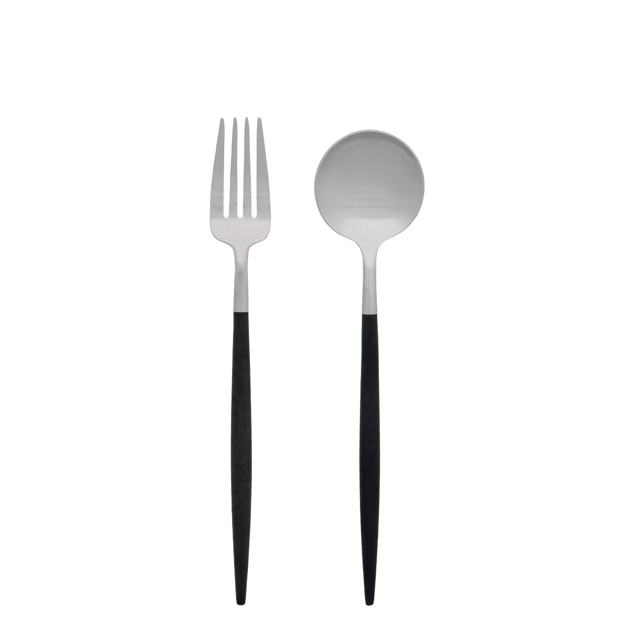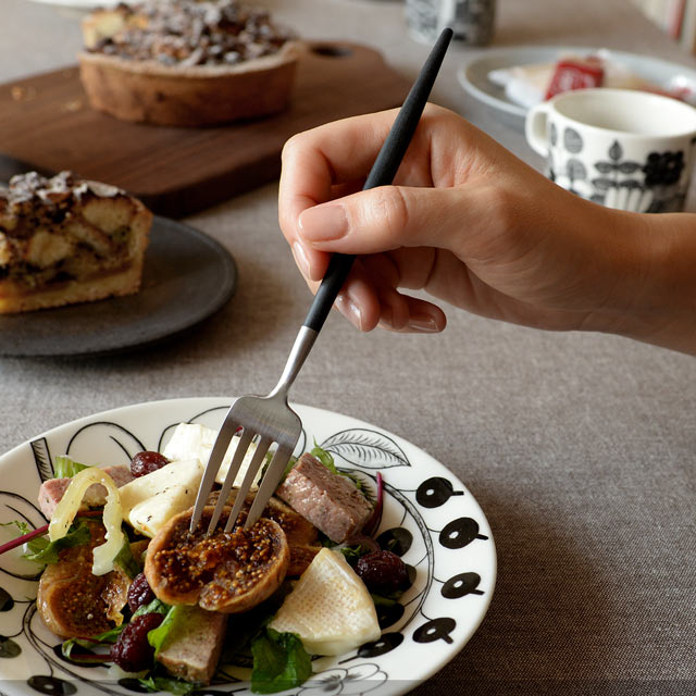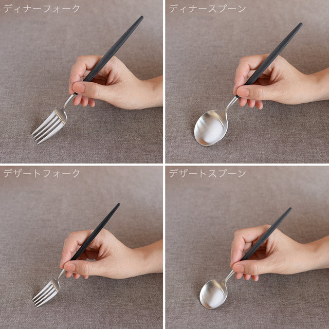 洗練されたフォルムで世界中で人気の高いポルトガルのカトラリーブランド「Cutipol」。1本1本ハンドメイドで仕上げられる作品とも言えるその美しいデザイン、人間工学に基づき設計された持ちやすさ、使いやすさをともなった機能的なカトラリーです。 細身の持ち手とステンレスとのコントラストでデザインされたGOAシリーズはクチポールを代表するシリーズ。適度なヘッドの重み、木製のようですべりにくいさらっとしたアセタール樹脂(25%ガラス繊維強化)の持ち手が絶妙なバランスで設計されており、誰もが使いやすさを実感できます。シンプルなのでどんなシーンともすうっと合ってしまう人気のブラック×シルバーのフォークとスプーンのセットです。 デザートシリーズはディナーシリーズに比べやや小ぶりながら20cm前後のプレートと相性がよく、女性の手に収まるちょうどいいサイズ。スプーン・フォークセットは食事からケーキまで使える幅が広くておすすめです。 ■商品名 クチポール GOAデザート フォーク・スプーン2本セット ブラック/マットシルバー ■サイズ(約) フォーク 長さ18.5cm、スプーン 長さ18cm 重さ(約):フォーク 19g、スプーン 25g ※ハンドメイドのため仕上げなど個体差があります。 ※輸送中の損傷を防ぐために個包装したうえエアクッション袋に梱包しております。 ■素材 18-10ステンレス、アセタール樹脂(25%ガラス繊維強化) 食洗機の使用可 ※高温洗浄は不可。手洗いをおすすめします。 ■製造 クチポール(キュティポール) ※当店はCutipolの日本正規取扱店です 生産国:ポルトガル