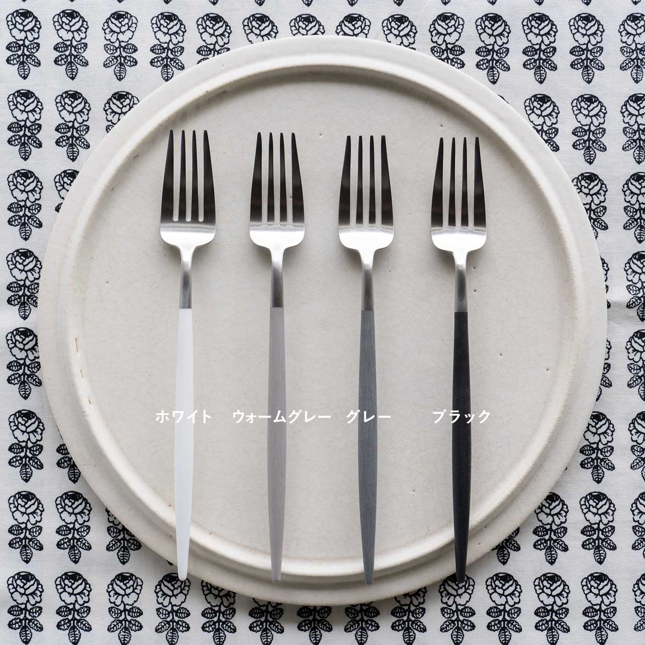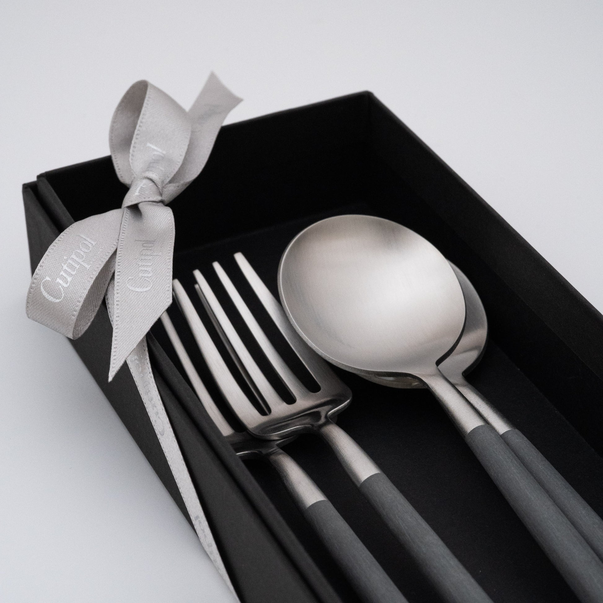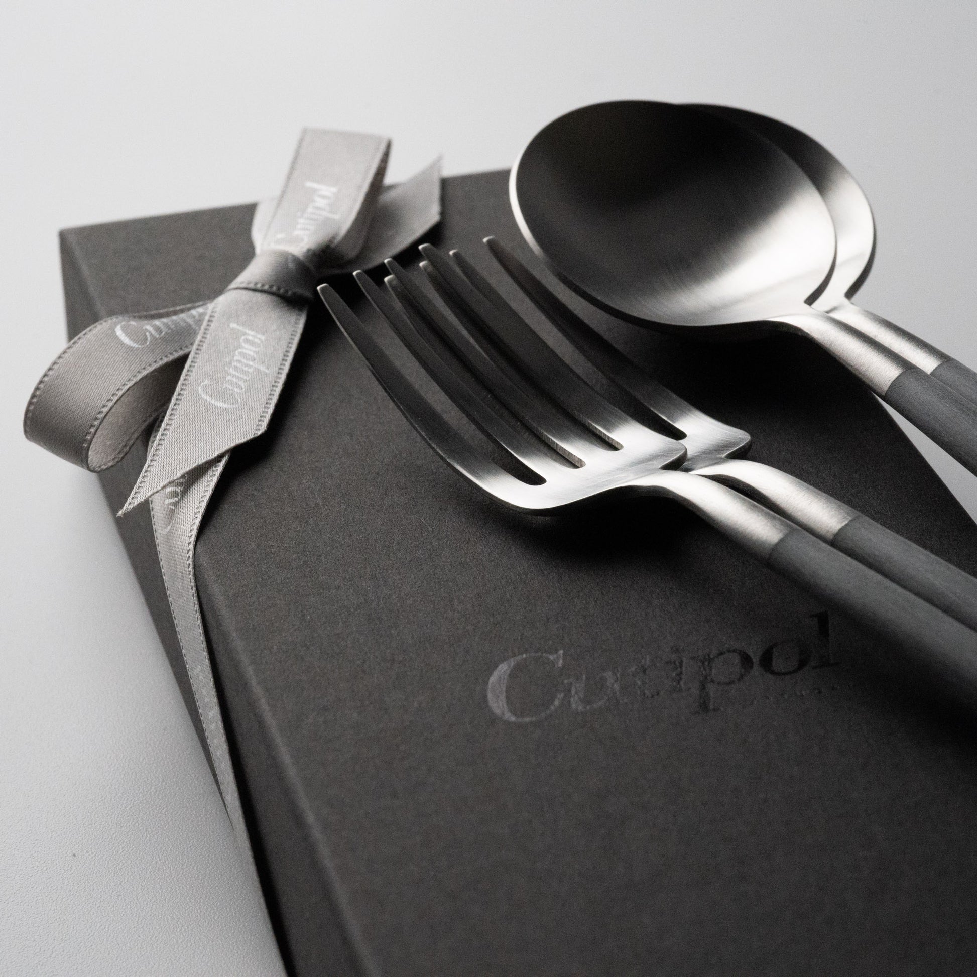 | 洗練されたフォルムで世界中で人気の高いポルトガルのカトラリーブランド「Cutipol」。1本1本ハンドメイドで仕上げられる作品とも言えるその美しいデザイン、人間工学に基づき設計された持ちやすさ、使いやすさをともなった機能的なカトラリーです。 細身の持ち手とステンレスとのコントラストでデザインされたGOAシリーズはクチポールを代表するシリーズ。適度なヘッドの重み、木製のようですべりにくいさらっとしたアセタール樹脂(25%ガラス繊維強化)の持ち手が絶妙なバランスで設計されており、誰もが使いやすさを実感できます。 グレーは定番ブラックよりも柔らかな印象を持ち、マットな洋食器や和食器などと相性がいいですね。 大切な人へのギフトに、日常使いにちょうど良いデザートフォークとスプーンをペアのカトラリーセットでご用意しました。クチポールロゴ入りのギフトボックスにロゴ入りリボンをかけてお届け。クチポール正規品の証となる日本語版のリーフレットも付属しており、クチポール社のメッセージとともに製造風景などが紹介されています。また、当店オリジナルショッパー(紙袋)が付属しておりますのでそのままプレゼントとしてお渡しいただけます。