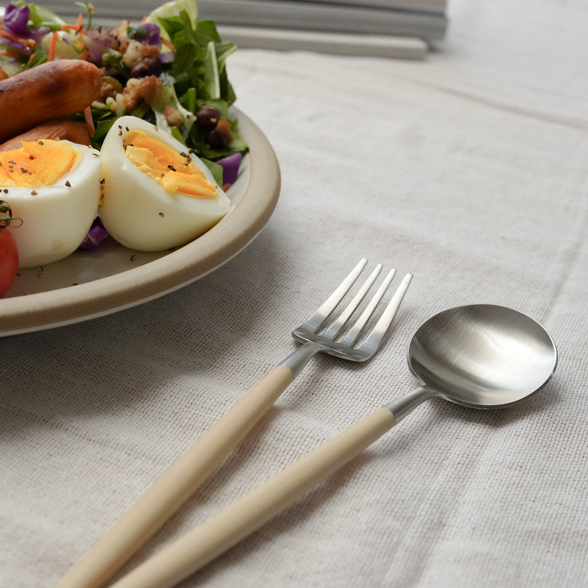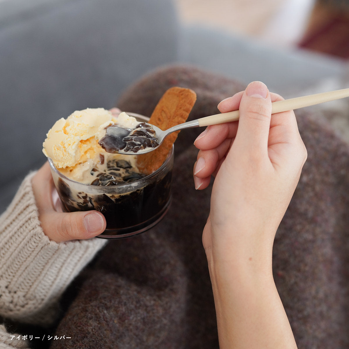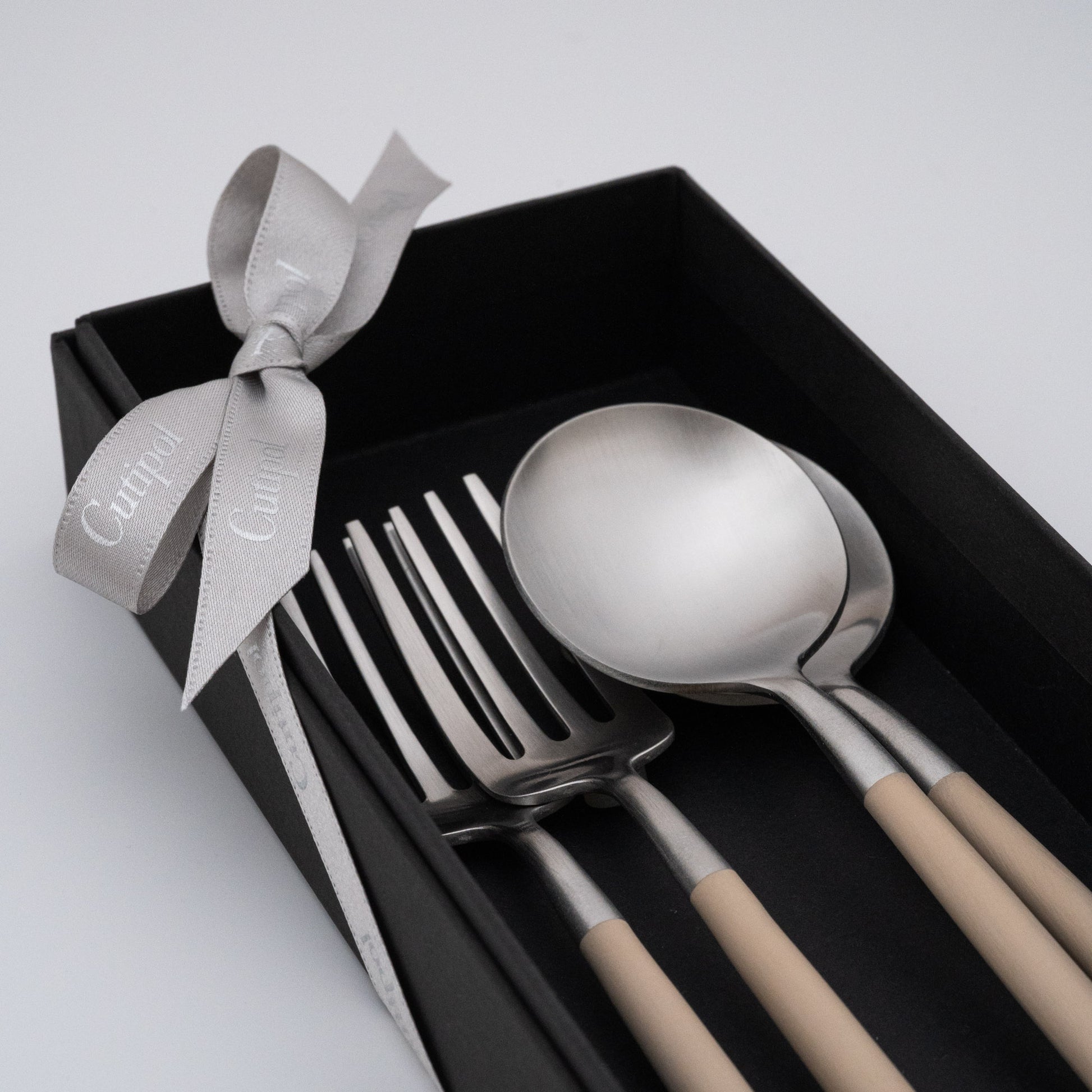 | 洗練されたフォルムで世界中で人気の高いポルトガルのカトラリーブランド「Cutipol」。1本1本ハンドメイドで仕上げられる作品とも言えるその美しいデザイン、人間工学に基づき設計された持ちやすさ、使いやすさをともなった機能的なカトラリーです。 細身の持ち手とステンレスとのコントラストでデザインされたGOAシリーズはクチポールを代表するシリーズ。適度なヘッドの重み、木製のようですべりにくいさらっとしたアセタール樹脂(25%ガラス繊維強化)の持ち手が絶妙なバランスで設計されており、誰もが使いやすさを実感できます。 ナチュラルテイストのアイボリーカラーは、ウッド調のテーブルやお皿とも相性がよく温かい雰囲気を出してくれます。 大切な人へのギフトに、日常使いにちょうど良いデザートフォークとスプーンをペアのカトラリーセットでご用意しました。