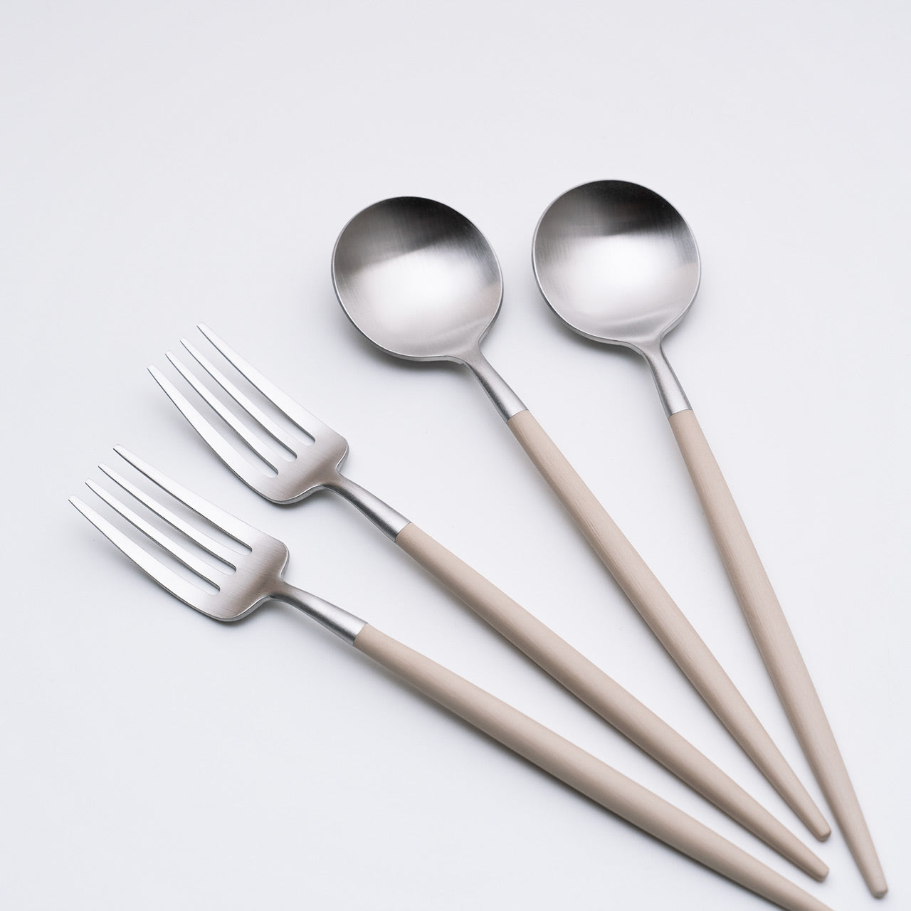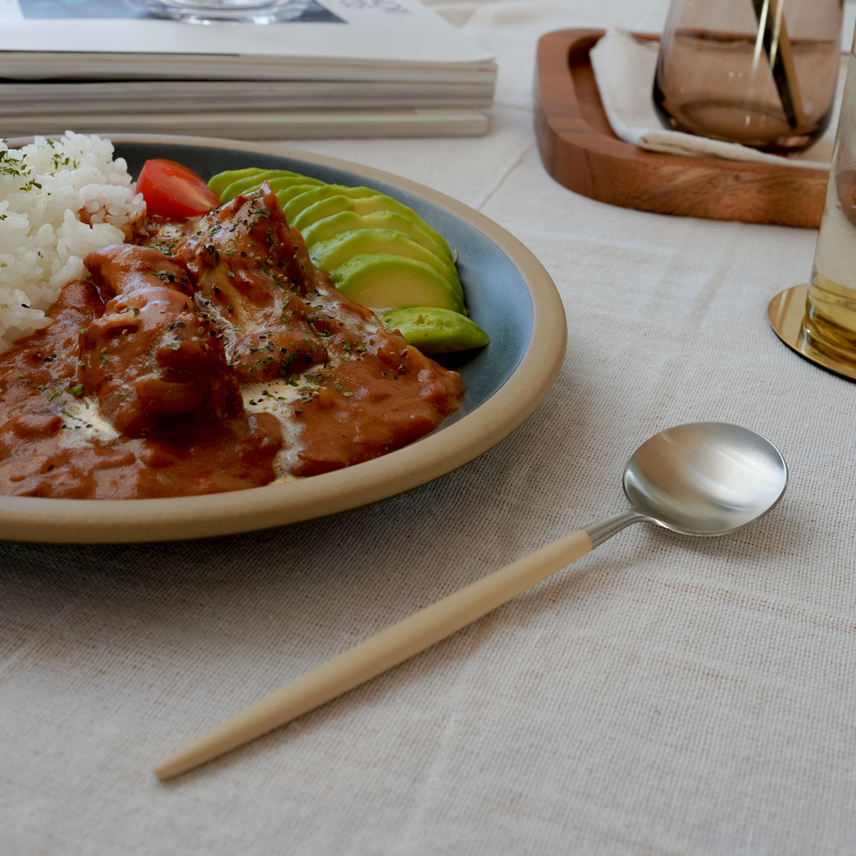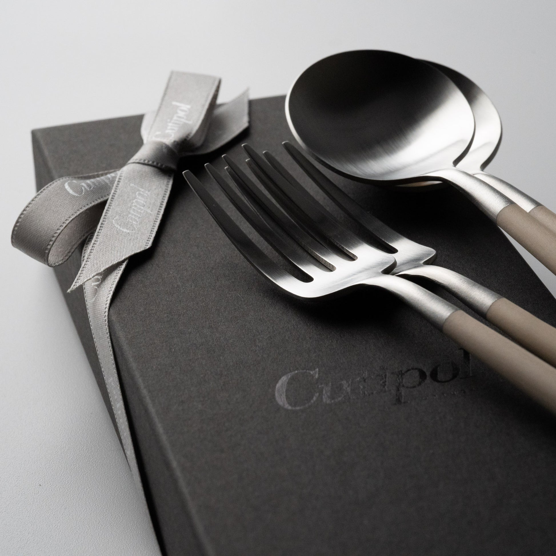 | 洗練されたフォルムで世界中で人気の高いポルトガルのカトラリーブランド「Cutipol」。1本1本ハンドメイドで仕上げられる作品とも言えるその美しいデザイン、人間工学に基づき設計された持ちやすさ、使いやすさをともなった機能的なカトラリーです。 細身の持ち手とステンレスとのコントラストでデザインされたGOAシリーズはクチポールを代表するシリーズ。適度なヘッドの重み、木製のようですべりにくいさらっとしたアセタール樹脂(25%ガラス繊維強化)の持ち手が絶妙なバランスで設計されており、誰もが使いやすさを実感できます。 ナチュラルテイストのアイボリーカラーは、ウッド調のテーブルやお皿とも相性がよく温かい雰囲気を出してくれます。 大切な人へのギフトに、日常使いにちょうど良いデザートフォークとスプーンをペアのカトラリーセットでご用意しました。
