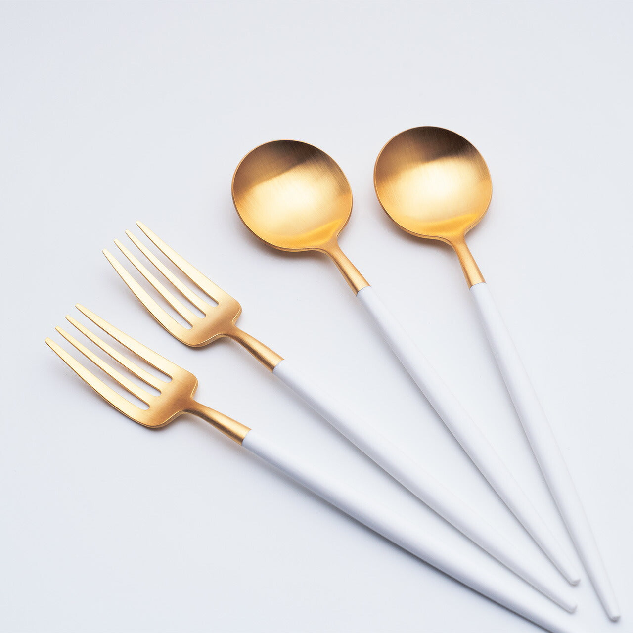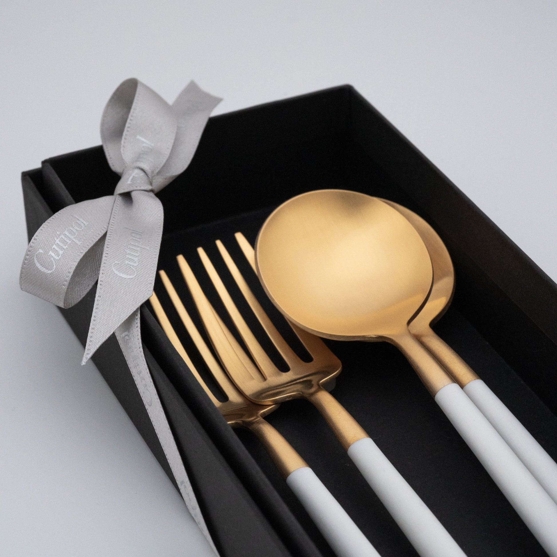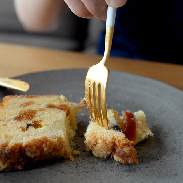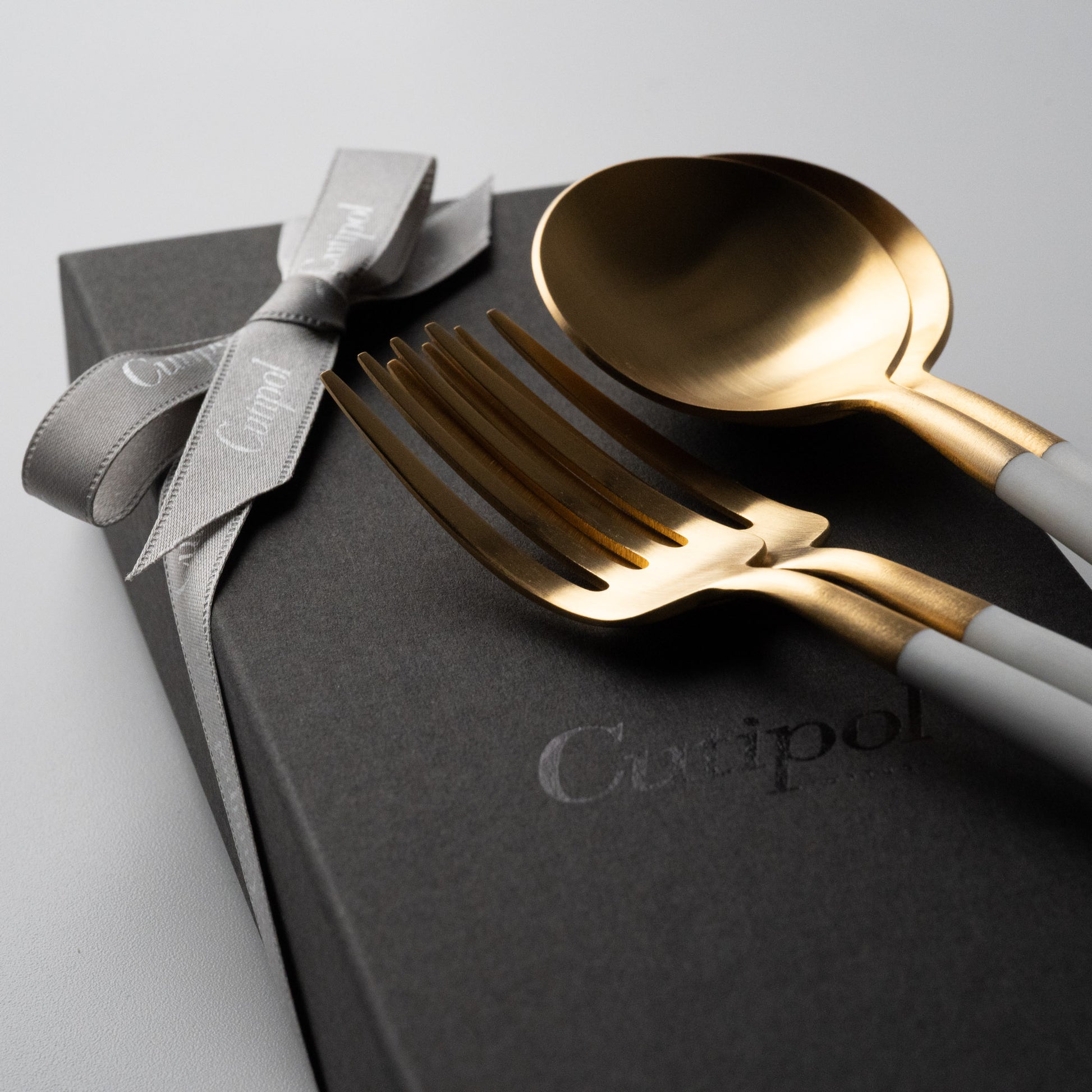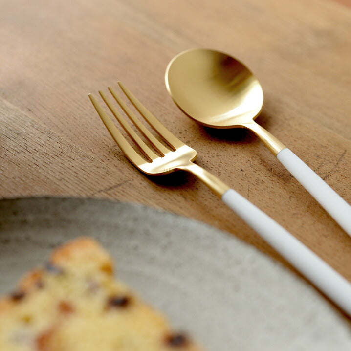 細身の持ち手とステンレスとのコントラストでデザインされたGOAシリーズはクチポールを代表するシリーズ。適度なヘッドの重み、木製のようですべりにくいさらっとしたアセタール樹脂(25%ガラス繊維強化)の持ち手が絶妙なバランスで設計されており、誰もが使いやすさを実感できます。 特別感のあるゴールドは、北欧食器をはじめ様々な食器と思いのほか相性が良く、テーブルを楽しく演出します。 大切な人へのギフトに、日常使いにちょうどいいデザートフォークとスプーンをペアのカトラリーセットでご用意しました。