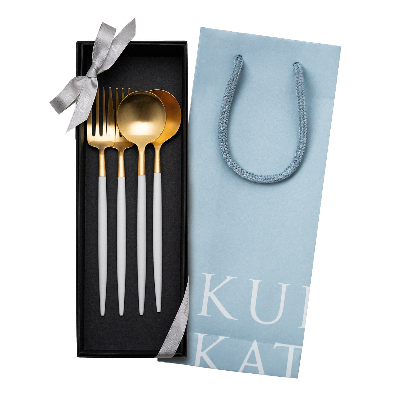 |  「あの人に喜んでもらいたい、普段から使ってほしいから。」ナイフなしでもカジュアルになりすぎない、ペアで使えるクチポールの4本ギフトセットをご用意しました。洗練されたイメージで予算10000円からの結婚祝いやお誕生日のプレゼントにぴったりでたいへん人気のギフトです。    洗練された雰囲気のクチポール純正リボンをヨーロッパ式の左斜め掛けでお届けします。(実際は箱をセットして外側に掛けます)  カトラリーが傷つかないようにクチポール巻きと言われる専用の薄紙でくるんで箱を閉じております。中には正規品の証となるクチポール社による日本版リーフレットが付属しており、クチポール社のメッセージとともに製造風景などが紹介されています。  持ち運びには必須の当店オリジナルショッパー(紙袋)が付属しておりますので、そのままプレゼントとしてお渡しいただけます。 当店は、クチポール公式ページに正規店舗として掲載されておりますので、大切なかたへの贈り物に安心してお選びください。   【公式サイト限定】 |