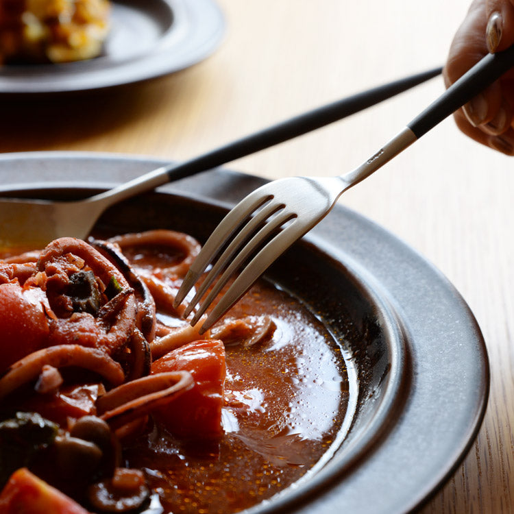 洗練されたフォルムで世界中で人気の高いポルトガルのカトラリーブランド「Cutipol」。1本1本ハンドメイドで仕上げられる作品とも言えるその美しいデザイン、人間工学に基づき設計された持ちやすさ、使いやすさをともなった機能的なカトラリーです。 Cutipolカトラリー2019年発表のMIOシリーズ。エレガントでソフトな曲線が特徴で柔らかい印象のカトラリーです。クチポールの定番シリーズのGOAと同様、適度なヘッドの重み、木製のようですべりにくいさらっとしたアセタール樹脂(25%ガラス繊維強化)の持ち手が絶妙なバランスで設計されており、誰もが使いやすさを実感できます。シンプルなのでどんなシーンともすうっと合ってしまう人気のブラック×シルバーの使用機会の多いディナーフォークとスプーンのセットをペアで揃えてます。 ■商品名 クチポール MIOディナーフォーク・スプーン 4本セット ブラック/マットシルバー ■サイズ(約) 長さ:フォーク 22.5cm、スプーン 22cm 重さ:フォーク 29g、スプーン 36g ※ハンドメイドのため仕上げなど個体差があります。 ※国内正規品 ※輸送中の損傷を防ぐために個包装したうえエアクッション袋に梱包しております。 ■素材 18-10ステンレス、アセタール樹脂(25%ガラス繊維強化) 食洗機の使用可 ※高温洗浄は不可。手洗いをおすすめします。 ■製造 クチポール(キュティポール) ※当店はCutipolの日本正規取扱店です 生産国:ポルトガル
