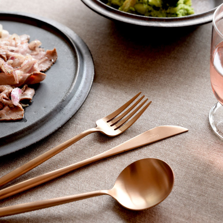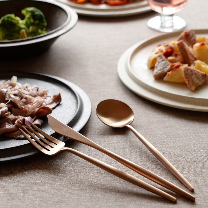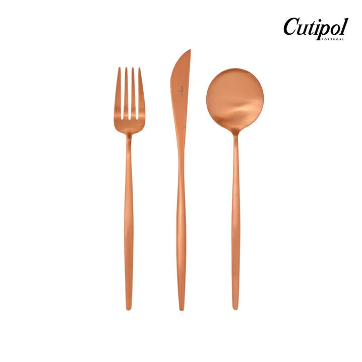 洗練されたフォルムで世界中で人気の高いポルトガルのカトラリーブランド「Cutipol」。1本1本ハンドメイドで仕上げられる作品とも言えるその美しいデザインは、人間工学に基づき設計された持ちやすさ、使いやすさをともなった機能的なカトラリーです。細身の持ち手とオールステンレスならではの適度な重みで、手にする喜びをデザインしたMOONシリーズ。シンプルで飽きのこないデザインがすべての料理にマッチします。 ■商品名 クチポール MOONディナー3本セット(ディナーナイフ/フォーク/スプーン) アンバーゴールド ■サイズ(約) 長さ:スプーン 20.3cm、ナイフ 22.2cm、フォーク 20.5cm 重さ:スプーン 62g、ナイフ 48g、フォーク 49g ※ハンドメイドのため仕上げなど個体差があります。 ※輸送中の損傷を防ぐために個包装したうえエアクッション袋に梱包しております。 ■材質 18-10ステンレス(24K PVDカッパーコーティング) 食洗機の使用可。 ※カトラリーどうしの接触は避けてください。 ※90℃以上の洗浄は避け、洗浄後はすぐに取り出し水気を拭いて乾燥させてください。 ※塩素系洗剤、研磨剤、スチールたわし、電子レンジ、オーブン使用不可。 ■製造 クチポール(キュティポール) ※当店はCutipolの日本正規取扱店です 生産国:ポルトガル