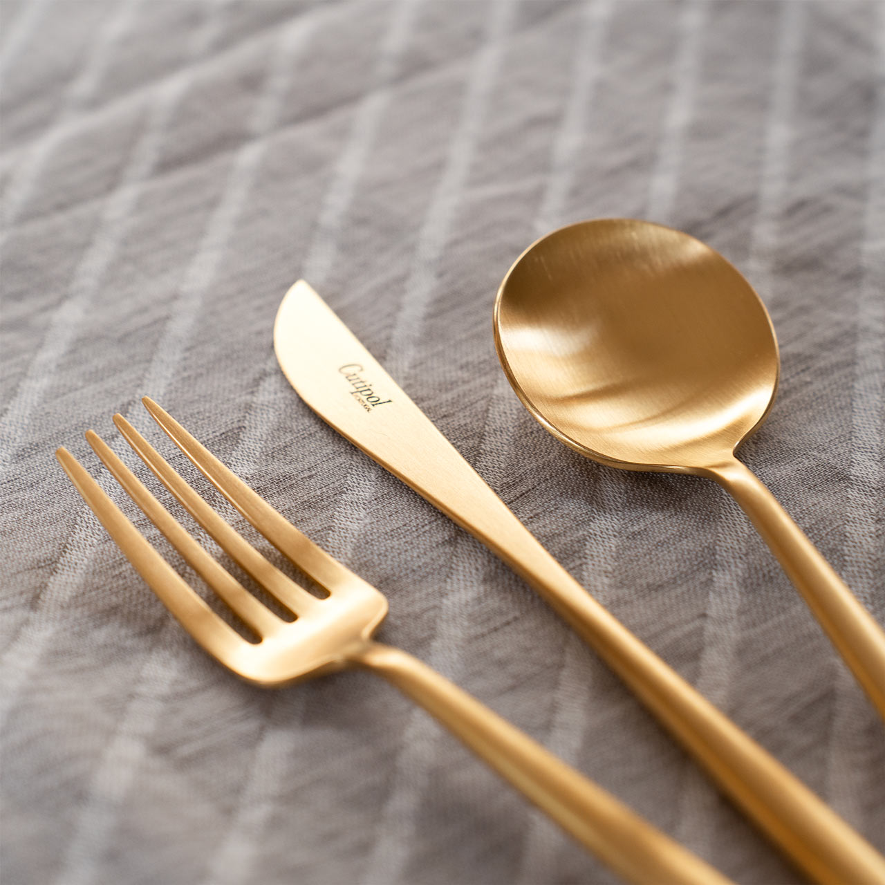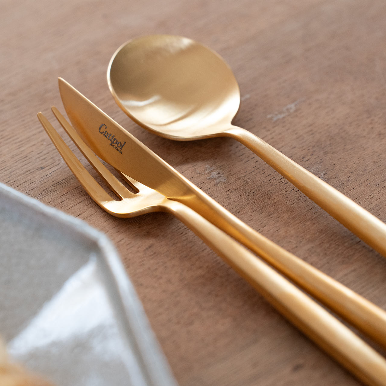 洗練されたフォルムで世界中で人気の高いポルトガルのカトラリーブランド「Cutipol」。1本1本ハンドメイドで仕上げられる作品とも言えるその美しいデザインは、人間工学に基づき設計された持ちやすさ、使いやすさをともなった機能的なカトラリーです。細身の持ち手とオールステンレスならではの適度な重みで、手にする喜びをデザインしたMOONシリーズ。 GOAシリーズのデザートサイズに比べやや小ぶりながら重みがあるためカジュアルになりすぎず、やや大きめのケーキ用、フルーツ用としても重宝します。 シンプルで飽きのこないデザインがすべての料理にマッチします。 ■商品名 クチポール MOON デザート 3本セット (ナイフ・フォーク・スプーン各1本)ゴールド ■サイズ(約) 長さ:ナイフ 18.2cm、スプーン 16.8cm、、フォーク 17cm 重さ:ナイフ 32g、スプーン 39g、フォーク 32g ※ハンドメイドのため仕上げなど個体差があります。 ※輸送中の損傷を防ぐために個包装したうえエアクッション袋に梱包しております。 ■材質 18-10ステンレス(24K PVDコーティング) 食洗機の使用可。 ※カトラリーどうしの接触は避けてください。 ※90℃以上の洗浄は避け、洗浄後はすぐに取り出し水気を拭いて乾燥させてください。 ※塩素系洗剤、研磨剤、スチールたわし、電子レンジ、オーブン使用不可。 ■製造 クチポール ※当店はCutipolの日本正規取扱店です 生産国:ポルトガル