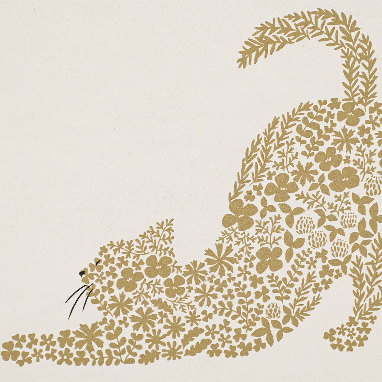 その伸びやかな動きを包み込むように、身近な草花がいきいきと重なり合い、流れる毛並みのラインを軽やかに描き出します。