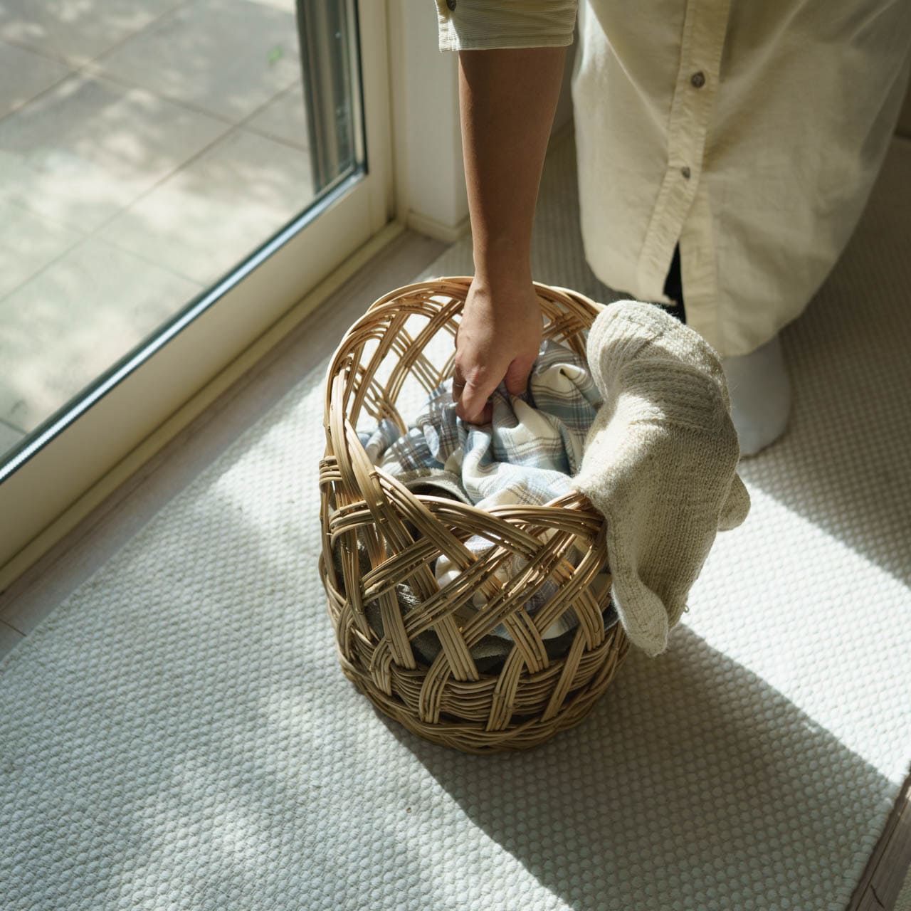 生活感を隠しすぎず、暮らしの気配をちょうどよく残してくれる、編み目の大きなメゴ笹のかご。作られる数がとても少なく「幻の籠」と言われています。竹の一種であるメゴ笹を、割ることなく丸竹のまま、編んでかごが作られます。細い竹ですがとても丈夫で、強度の高いかごに仕上がります。小割にしてひごになっていないそのままの竹なので、かごの内側も表面も竹のまま。小さな節の凸は、より竹らしい趣を感じさせてくれます。暮らしに迎えてから、丸竹だから、毛羽立ちやささくれがないことに気がつきました。小さな子供が触っても安心です。ちくちくしない、つるつるでさらっとした触り心地は、夏にも冬にも気持ちがいいです。大きさのわりに竹なので軽く、移動も気軽です。無駄なく隅を埋めるように四角いかごが並んでいるのも好きだけど、単体の丸いかごの存在感も良い感じ。丸いメゴ籠ひとつぽっと置いてみた空間をみて、インテリアを楽しめていると嬉しくなります。昔ながらのメゴ籠という工芸品が現代の暮らしに馴染むのは、シンプルながら職人技巧の美しい竹細工の模様がスタイリッシュなことと、天然の素材であること、そしてその優しい色味だからでしょうか。あなたの家にもきっと似合います。入れるもの、飾る場所、にやにやしながら考えちゃってください。 |