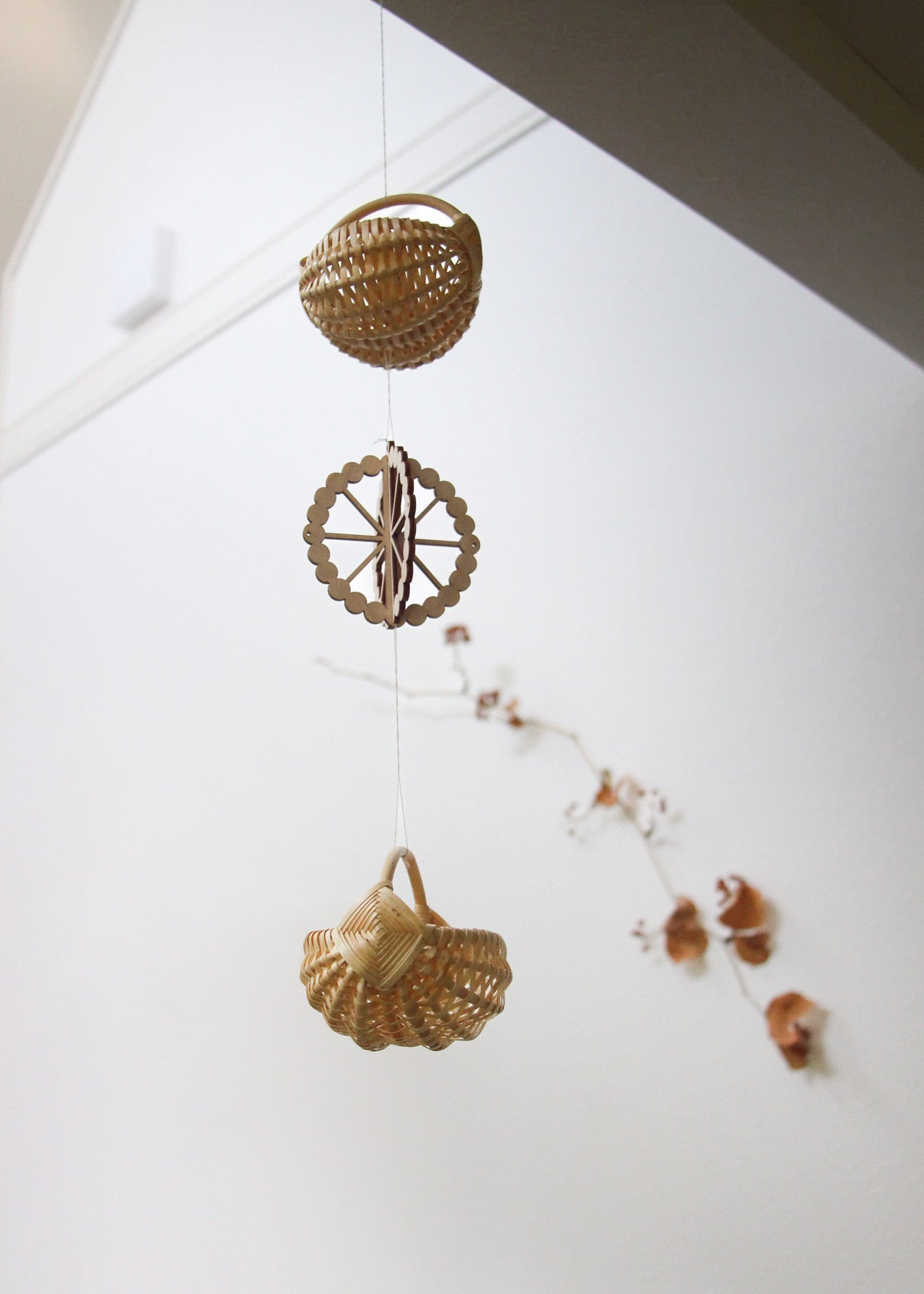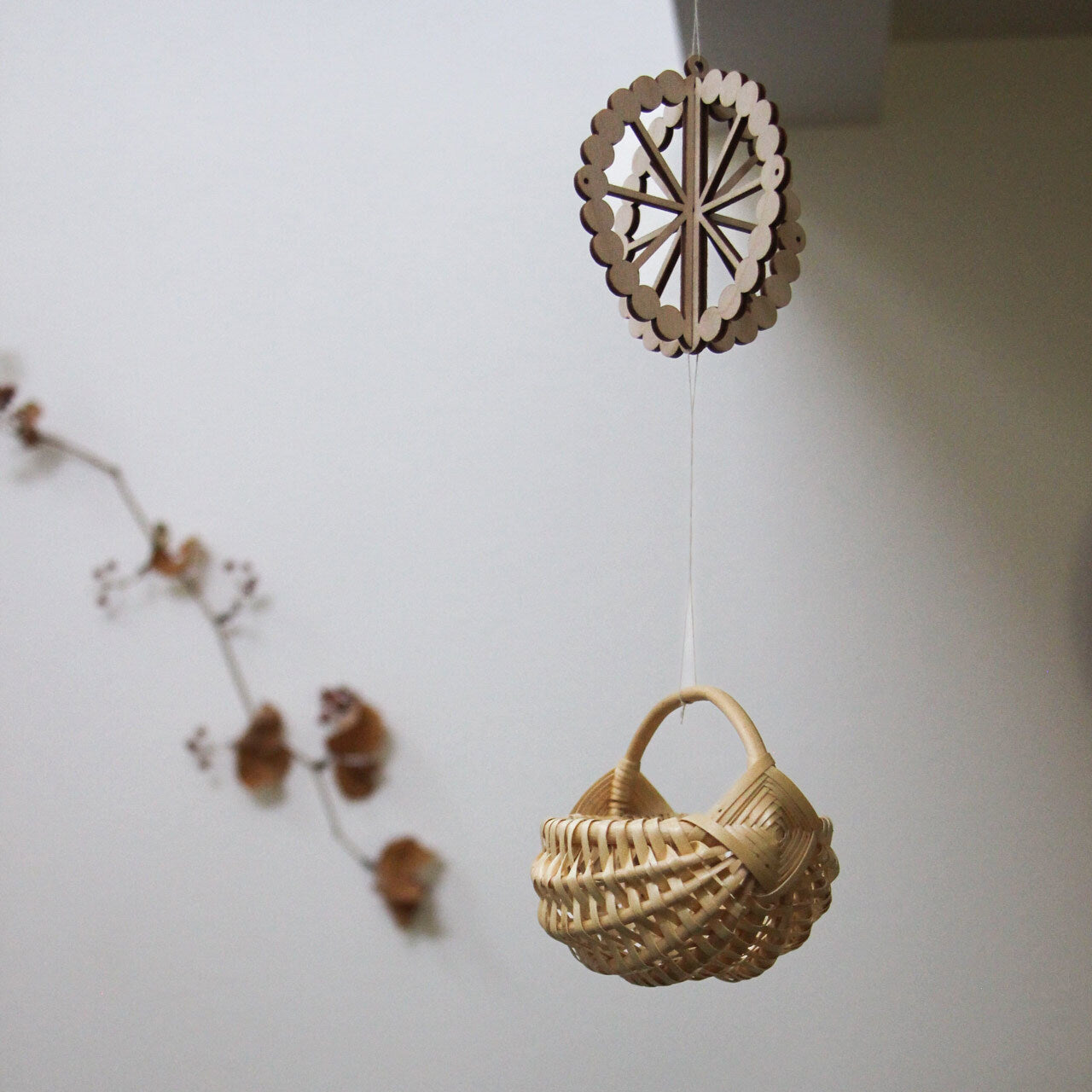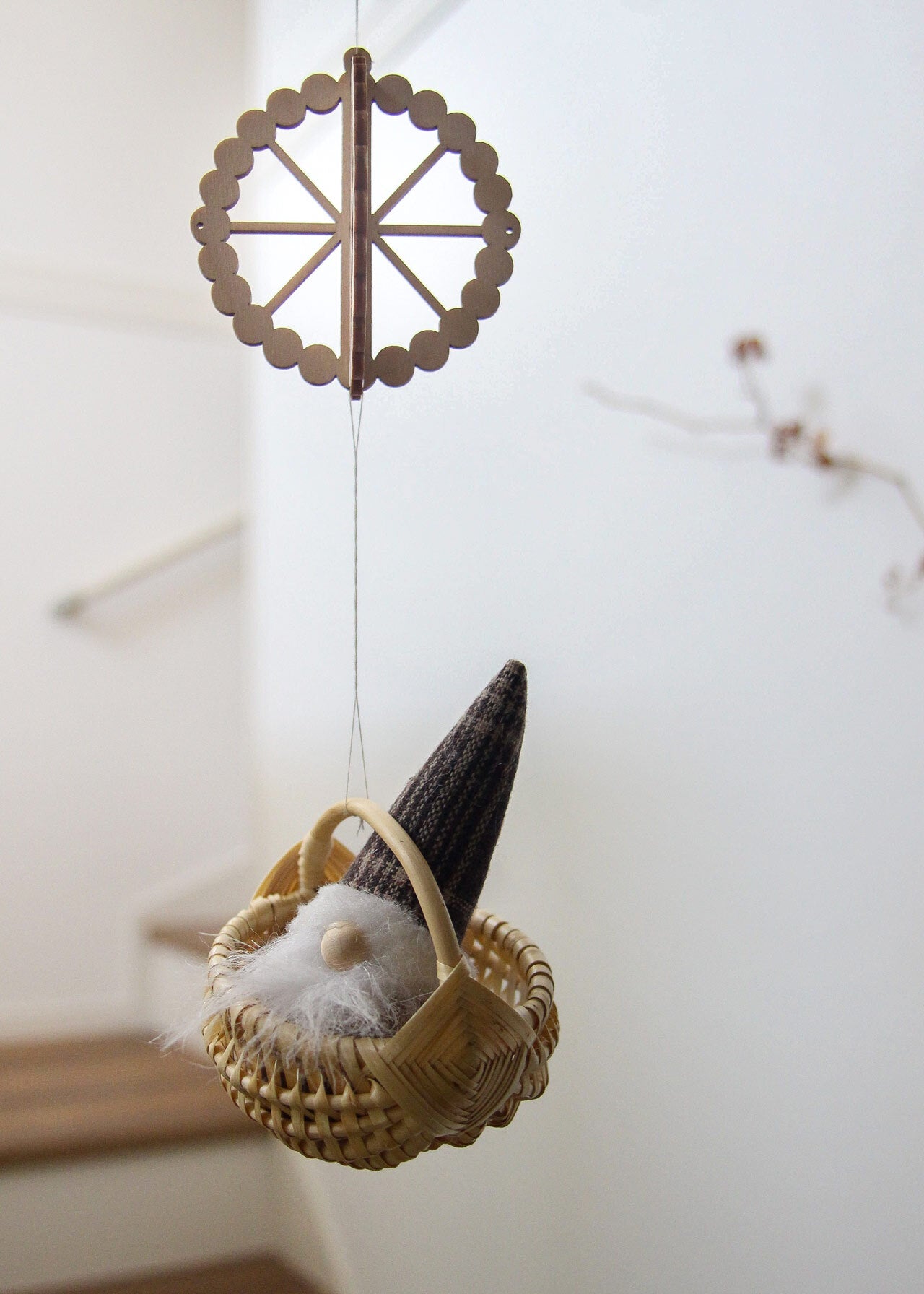 リトアニアのkito サンフラワー せっかくの美しい編み柄ですから、お部屋のどこからでも見えるようにモビールにも。いくつかオーナメントを合わせたり、ドライにした草花を一緒に吊るしてみたり、、、 我が家は娘のリクエストでサンタさんのお家になりました。 ![]() ミニバスケットSのかたち