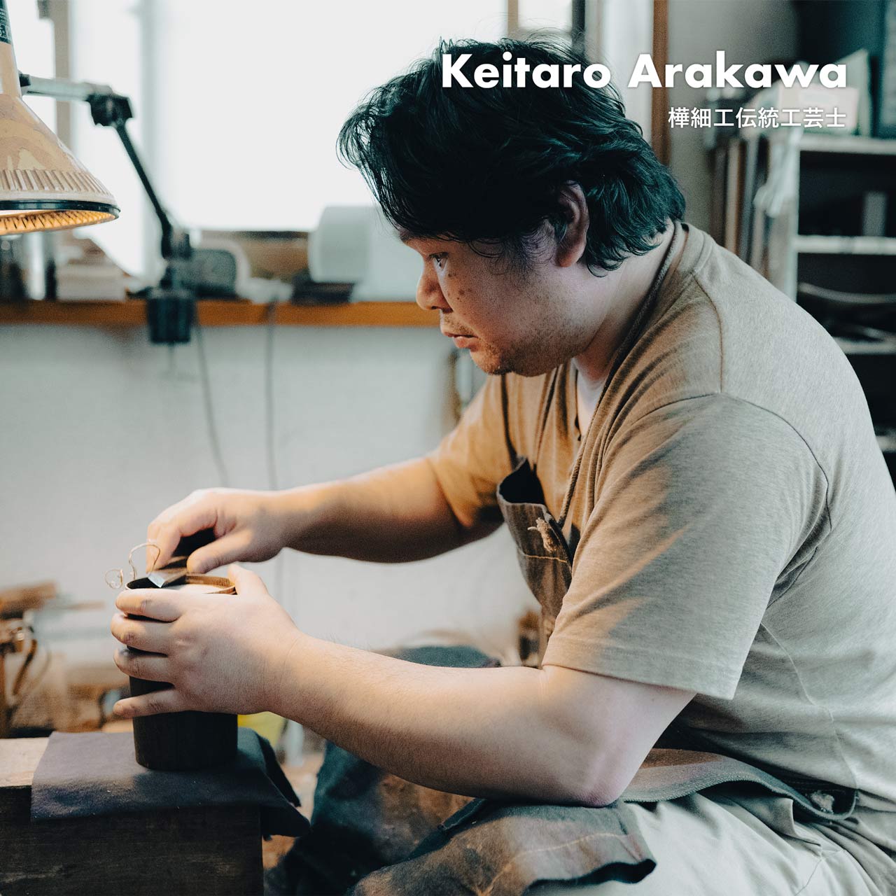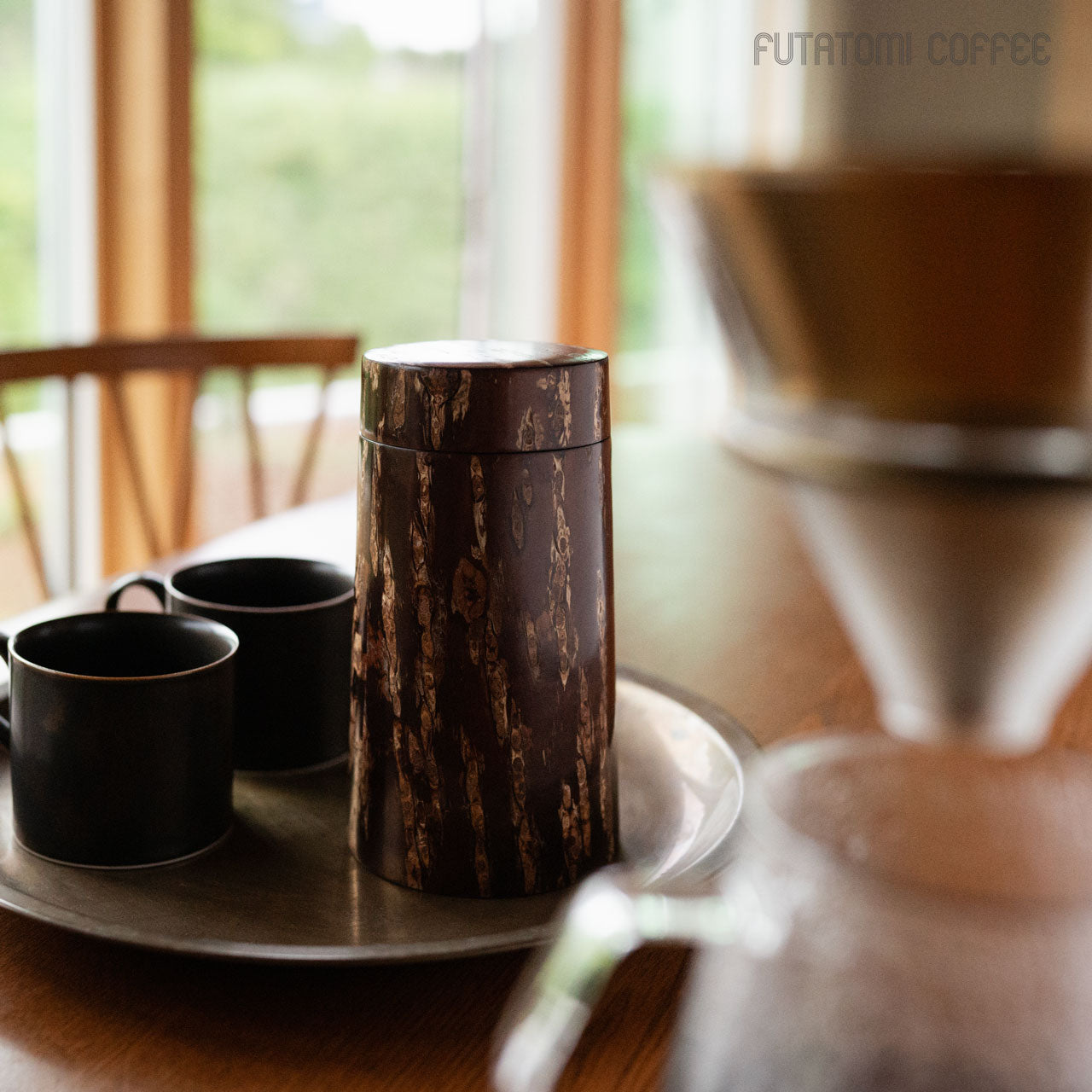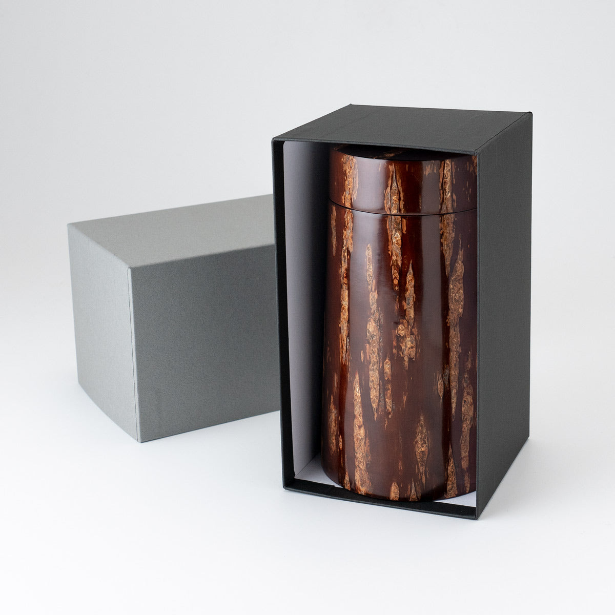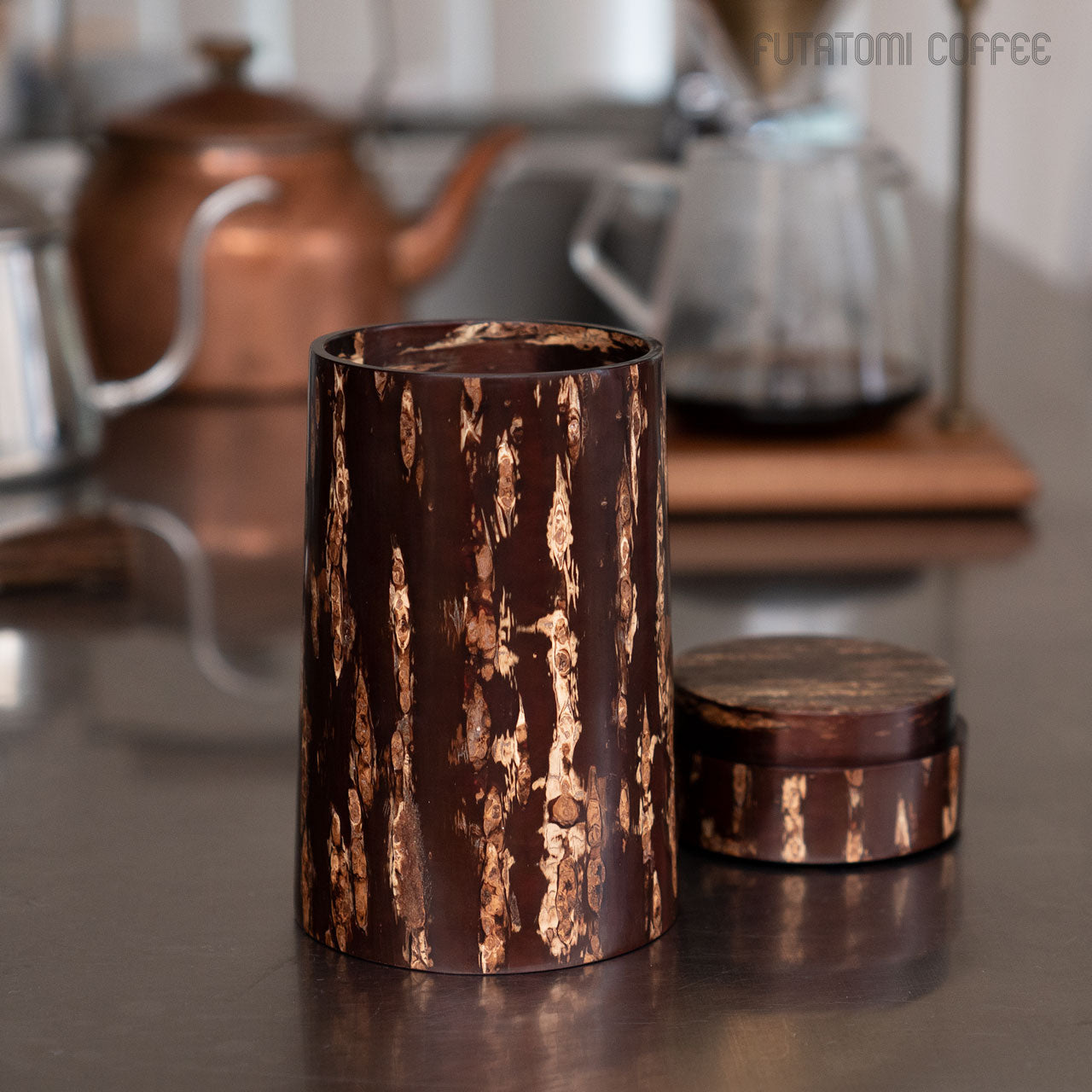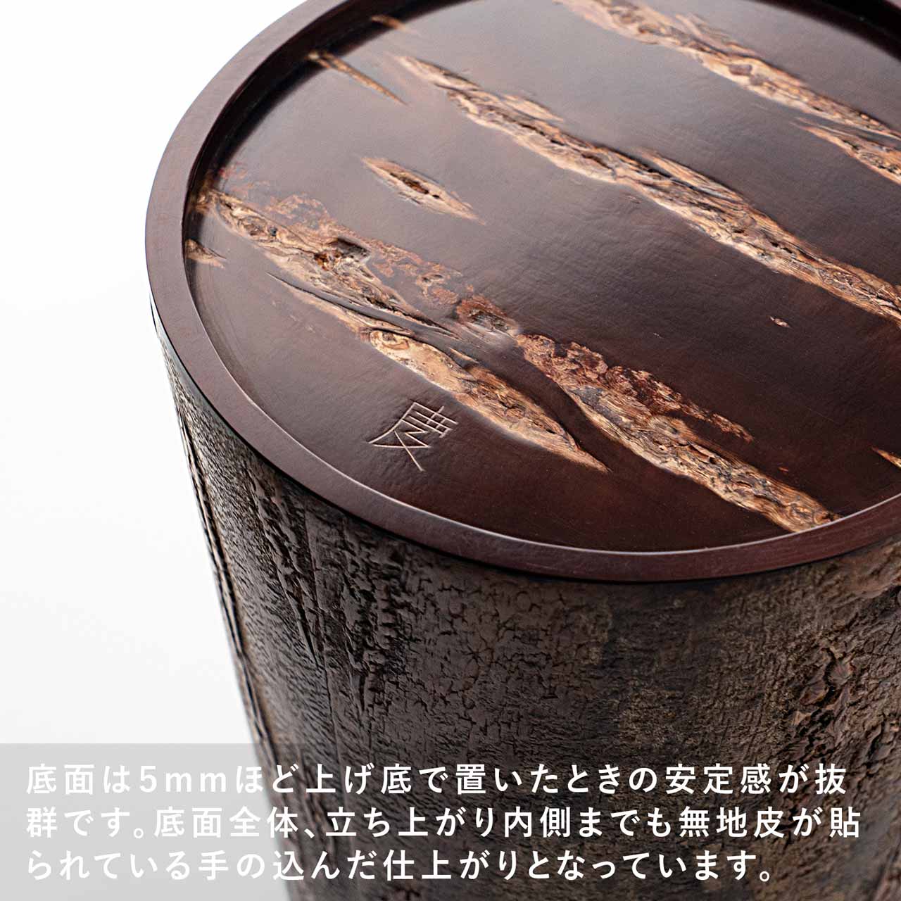 適度な湿度を保って茶葉を良い状態で保存できることで知られる樺細工の茶筒。同じく焙煎したコーヒー豆やその挽いた粉に触れる空気やその湿度を調整し、光から守ってくれる役割を求めたときに、この樺細工のキャニスターがベストな選択なのではと思います。 キッチンにあるだけで景色が変わる唯一無二の存在感。 ![]() 復刻したキャニスターコーン制作するのは伝統工芸士の荒川慶太郎さん。 「茶筒とは違う円錐形なので、使う木型も違うんですよ。それに、桜皮や、筒の外側と内側の皮の間に挟む経木を切り取る際に曲線を付けないといけないのですが、扇型の曲線を付けるのはけっこう手間なんです。常に完成図を想像して制作していく感じですね。」 茶筒をコーヒーキャニスターに流用するということでひと昔前に藤木伝四郎商店で原型がデザインされましたが、その時は製品として流通しませんでした。蓋もいまとは違う設計。荒川さんは円錐形の珍しい形に合わせた蓋の設計にかなり苦労をしたとのことですが、藤木伝四郎商店の復刻への想い、荒川さんの新しい感覚と熱意からキャニスターコーンはようやく完成しました。 「職人に限らずですが、何かを長く続けていると、新しいことに手を出さなくなってくるじゃないですか。安定したやり方を続けていってしまう。だから、キャニスターコーンのように、いつも作っているものと少し違うものを作るというのは、ある種の挑戦なんだろうなと思います。」 伝統技術により作られるキャニスターコーン8月〜9月の東北地方、山に入った山師が天然ヤマザクラの太い幹から樹皮をきれいに剥がす「樺はぎ」が行われます。剥いだ樹皮を天井裏などで約2年間乾燥させた後、職人の手によって1枚1枚に削りと磨きを繰り返して作られるのが樺細工の特徴となる「桜皮」です。 「50年前の樺細工のお直しも受けてますよ」1851年創業から170年続く伝四郎商店ではすべてお直しも受けてくれますので、一生ものとして入手できます。 ■商品名 ■サイズ 約 ■素材 ■作り手 荒川慶太郎 |