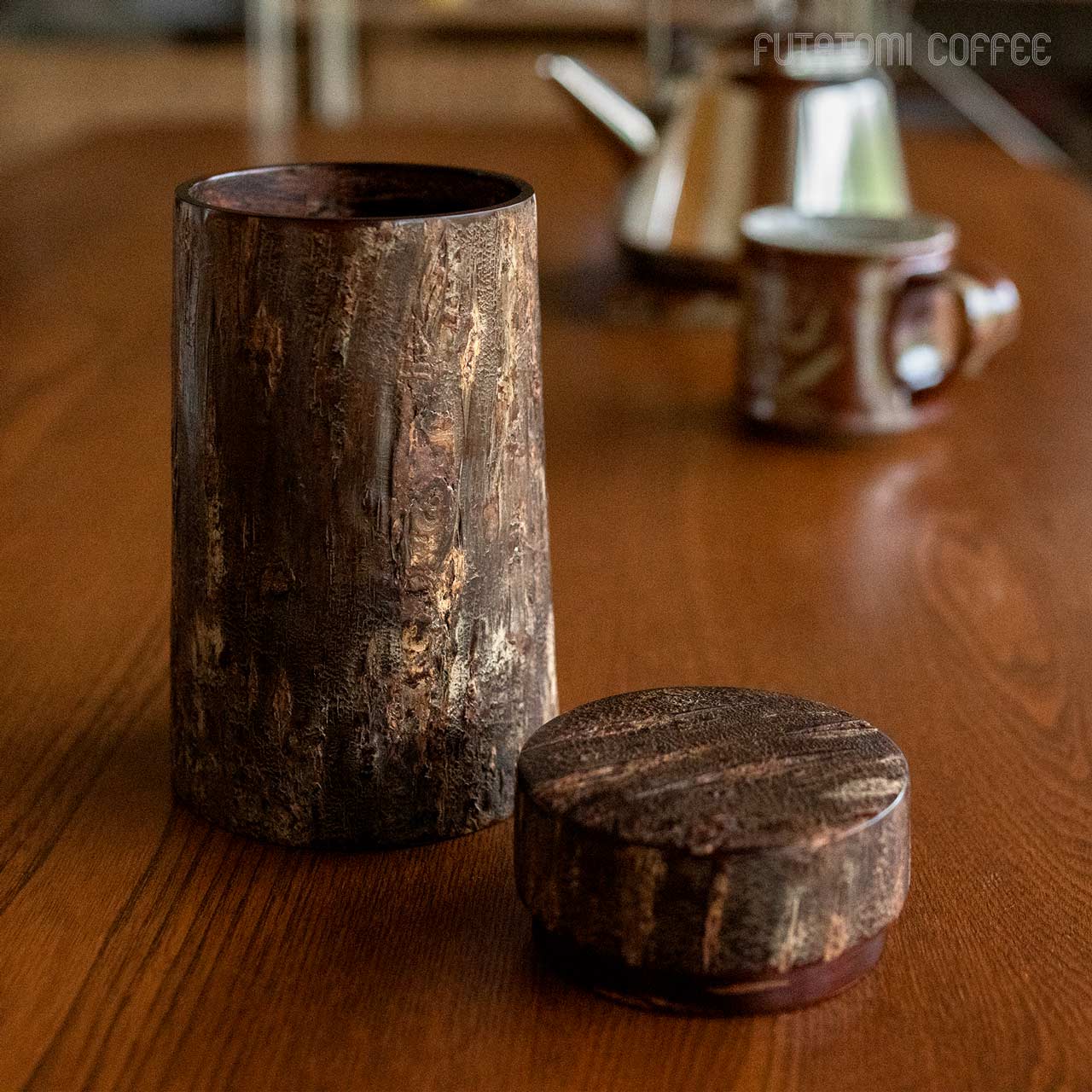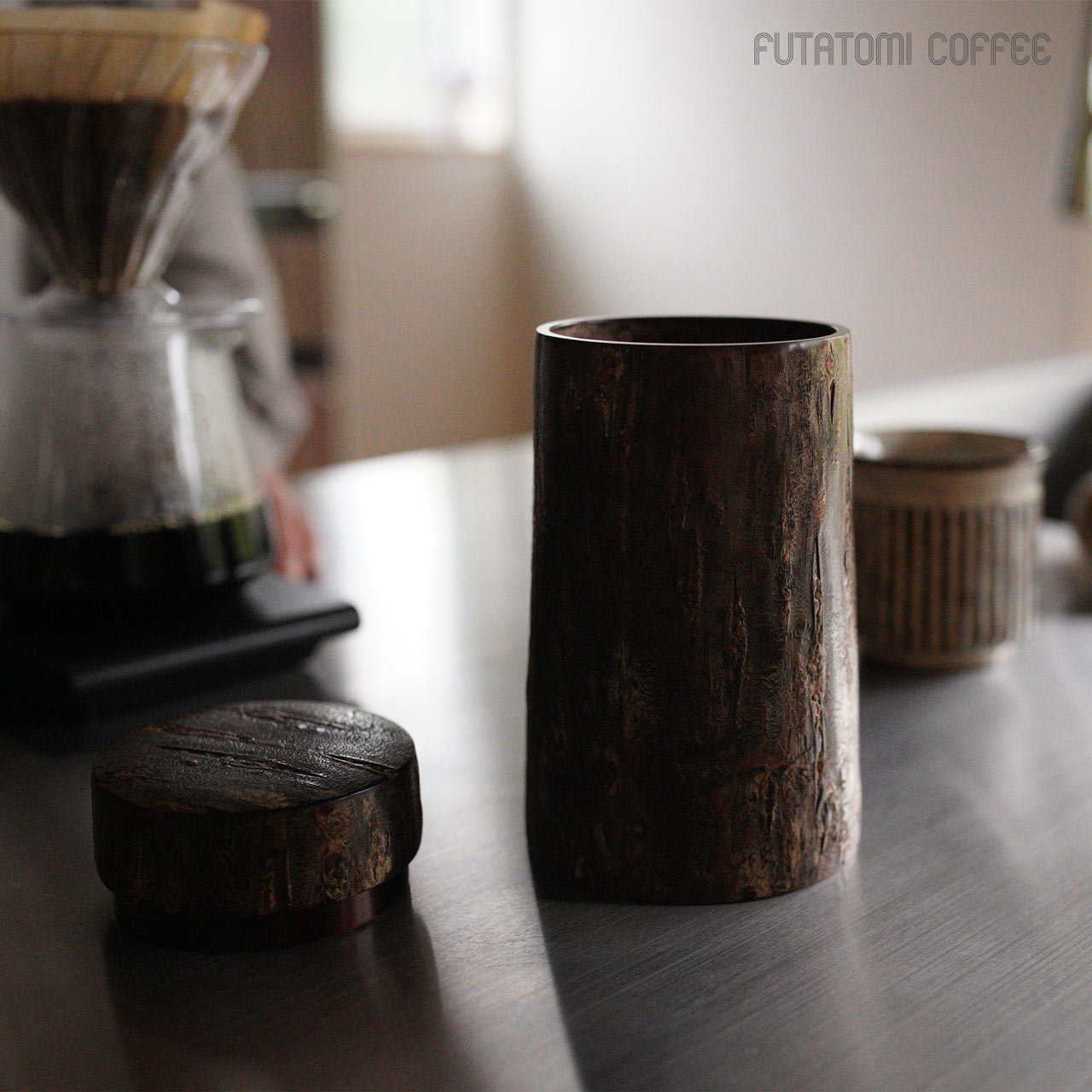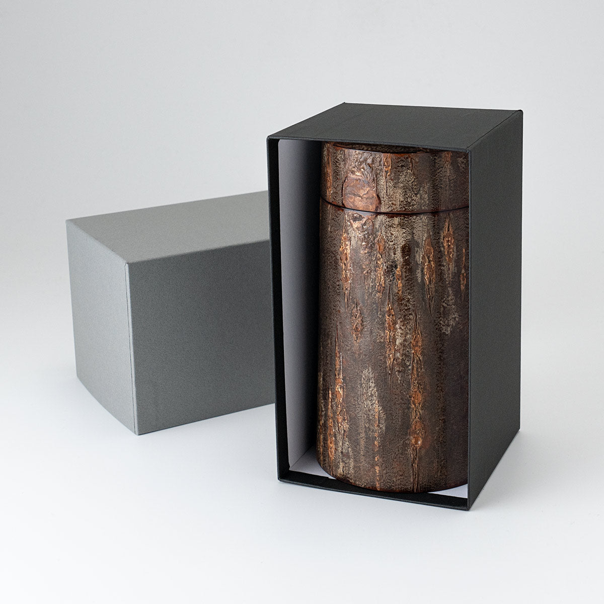 適度な湿度を保って茶葉を良い状態で保存できることで知られる樺細工の茶筒。同じく焙煎したコーヒー豆やその挽いた粉に触れる空気やその湿度を調整し、光から守ってくれる役割を求めたときに、この樺細工のキャニスターがベストな選択なのではと思います。 そして樺細工の魅力は、日常の道具として使えば使うほど桜皮の艶が増したり、深い色合いに何十年も育って愛着が湧いてくるところ。自然材料から生み出される高級な伝統工芸品ではありますが、ぜひ飾らずに道具として毎日使ってください。 あるだけで景色が変わる唯一無二の存在感驚くほど丁寧に作り込まれた樺細工に触れると、ものを大事に扱うという豊かさに気づきます。手に馴染んで自分の道具となったとき、一生もののコーヒーキャニスターを見つけた喜びは他の容器ではちょっと味わえない感覚です。 復刻したキャニスターコーン制作するのは伝統工芸士の荒川慶太郎さん。 「茶筒とは違う円錐形なので、使う木型も違うんですよ。それに、桜皮や、筒の外側と内側の皮の間に挟む経木を切り取る際に曲線を付けないといけないのですが、扇型の曲線を付けるのはけっこう手間なんです。常に完成図を想像して制作していく感じですね。」 茶筒をコーヒーキャニスターに流用するということでひと昔前に藤木伝四郎商店で原型がデザインされましたが、その時は製品として流通しませんでした。蓋もいまとは違う設計。荒川さんは円錐形の珍しい形に合わせた蓋の設計にかなり苦労をしたとのことですが、藤木伝四郎商店の復刻への想い、荒川さんの新しい感覚と熱意からキャニスターコーンはようやく完成しました。 「職人に限らずですが、何かを長く続けていると、新しいことに手を出さなくなってくるじゃないですか。安定したやり方を続けていってしまう。だから、キャニスターコーンのように、いつも作っているものと少し違うものを作るというのは、ある種の挑戦なんだろうなと思います。」 伝統技術により作られるキャニスターコーン8月~9月の東北地方、山に入った山師が天然ヤマザクラの太い幹から樹皮をきれいに剥がす「樺はぎ」が行われます。剥いだ樹皮を天井裏などで約2年間乾燥させた後、職人の手によって1枚1枚に削りと磨きを繰り返して作られるのが樺細工の特徴となる「桜皮」です。 熟練の伝統工芸士が、円形の木型に膠を塗った経木とともに桜皮を巻き付け、火で炙った金ゴテで押さえながら成形させて筒状のパーツを揃えていきます。 パーツを組み上げていきながら、細い木口をはじめ全面の表裏に正確に桜皮を貼り付けて、さらに磨きをかけて仕上げていきながら完成さます。秋田県角館で200年以上も続く伝統技術です。 「50年前の樺細工のお直しも受けてますよ」1851年創業から170年続く伝四郎商店ではすべてお直しも受けてくれますので、一生ものとして入手できます。 樺細工の伝統工芸士がつくるコーヒー豆のキャニスター。ヤマザクラ の樹皮は調湿性があると言われることから、茶筒の素材として馴染み深い工芸品ですが、コーヒー豆の保存にも。底から蓋に向かってすぼまっているので、傾けた時にコーヒー豆が一気に出ない構造です。 藤木伝四郎商店(秋田角館) ■商品名 ■サイズ 約 ■素材 ■作り手 |