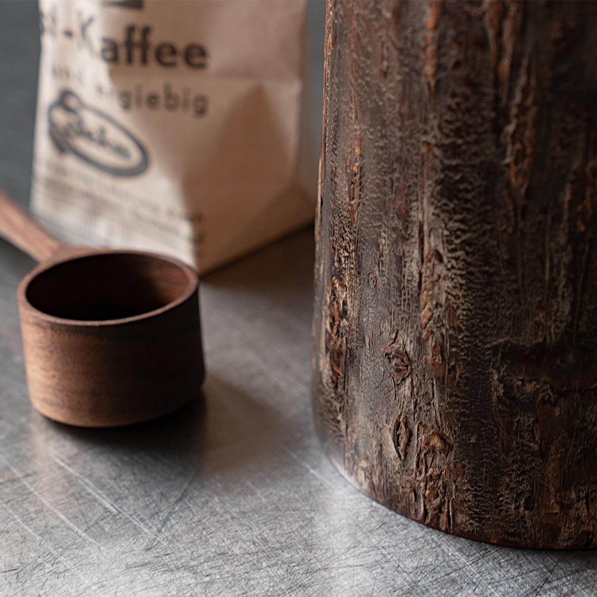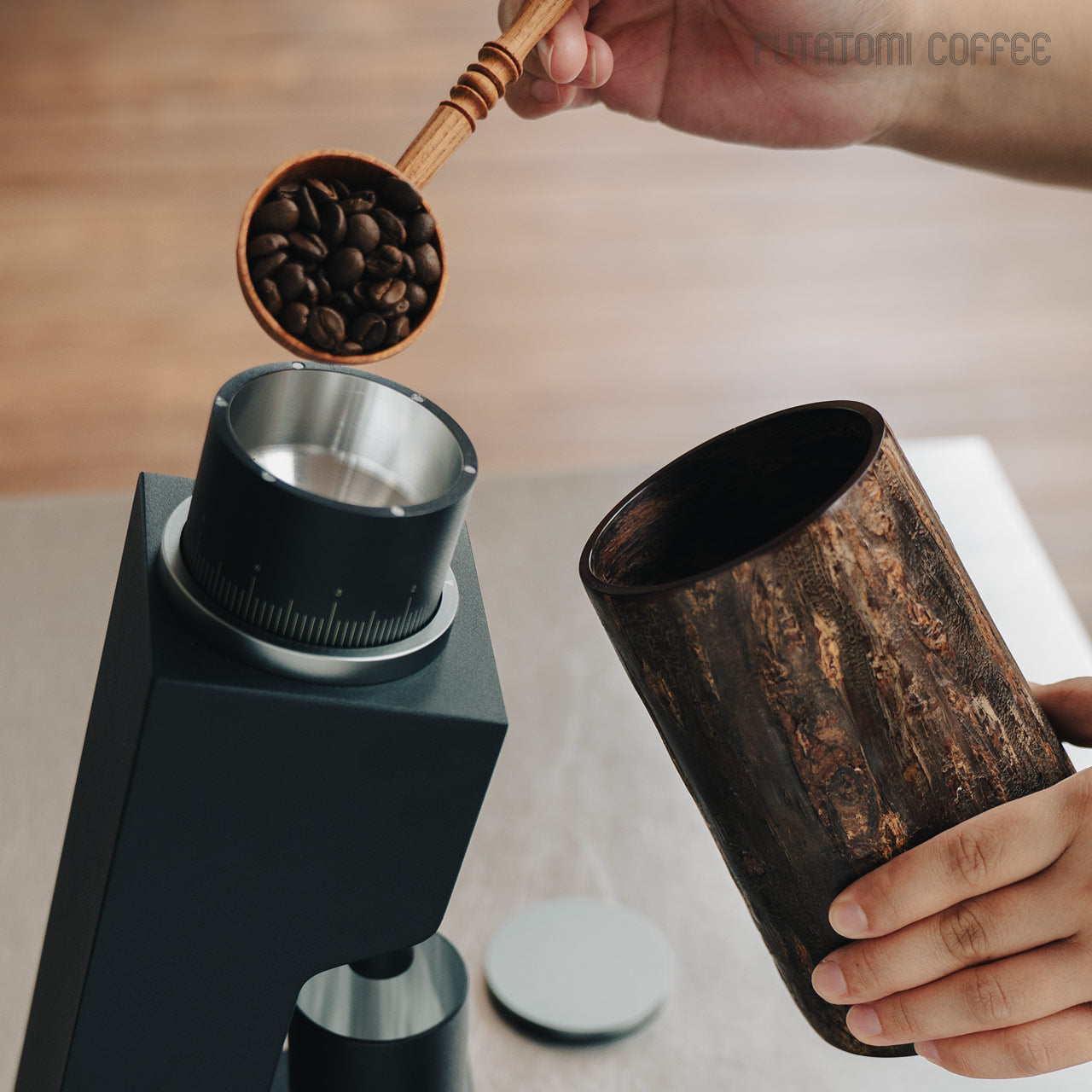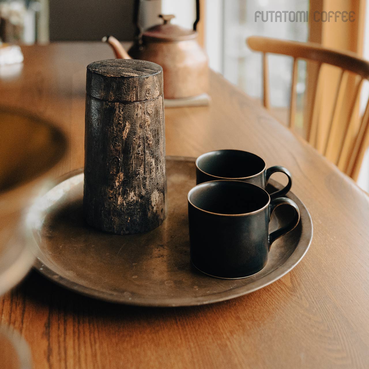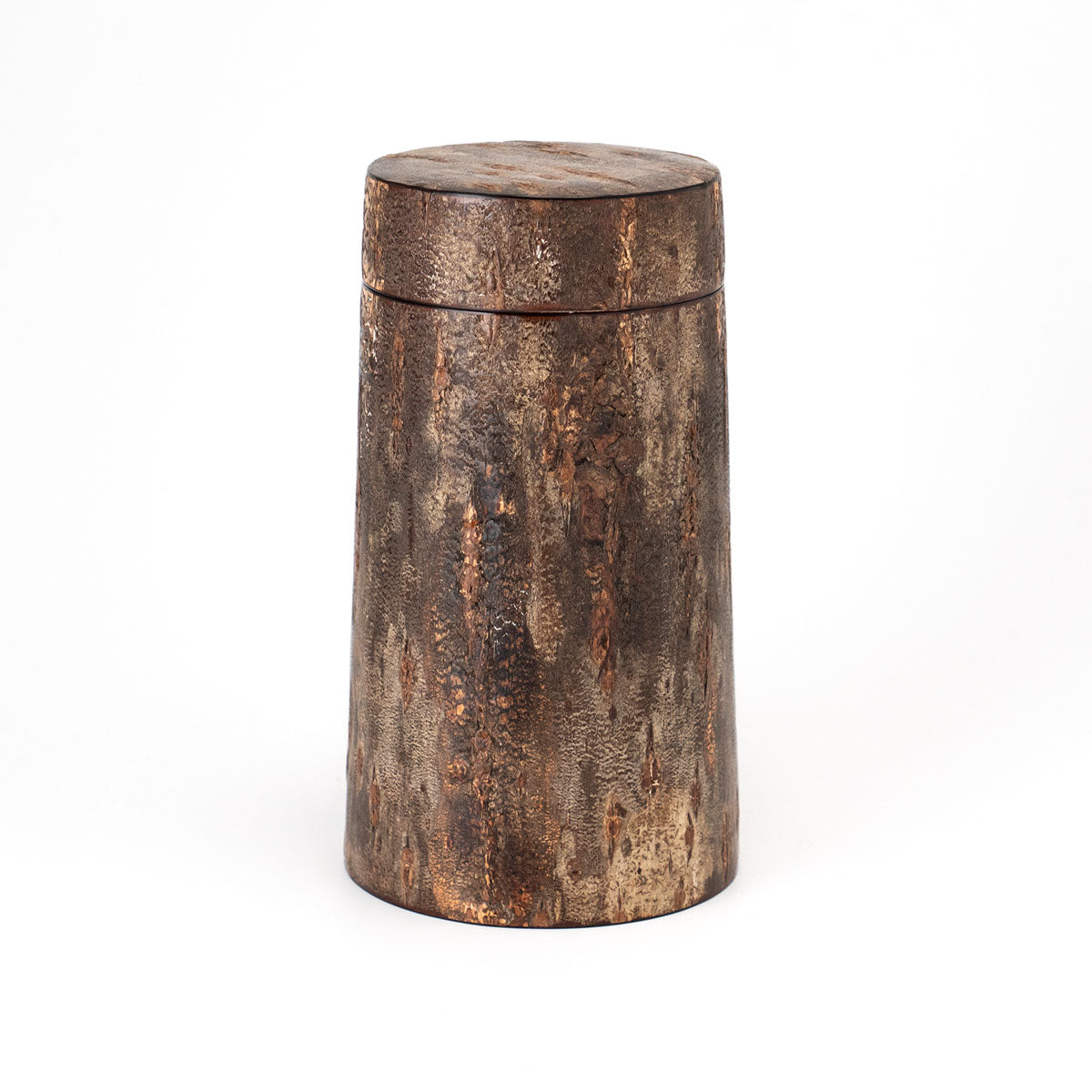 適度な湿度を保って茶葉を良い状態で保存できることで知られる樺細工の茶筒。同じく焙煎したコーヒー豆やその挽いた粉に触れる空気やその湿度を調整し、光から守ってくれる役割を求めたときに、この樺細工のキャニスターがベストな選択なのではと思います。 そして樺細工の魅力は、日常の道具として使えば使うほど桜皮の艶が増したり、深い色合いに何十年も育って愛着が湧いてくるところ。自然材料から生み出される高級な伝統工芸品ではありますが、ぜひ飾らずに道具として毎日使ってください。 あるだけで景色が変わる唯一無二の存在感驚くほど丁寧に作り込まれた樺細工に触れると、ものを大事に扱うという豊かさに気づきます。手に馴染んで自分の道具となったとき、一生もののコーヒーキャニスターを見つけた喜びは他の容器ではちょっと味わえない感覚です。 復刻したキャニスターコーン制作するのは伝統工芸士の荒川慶太郎さん。 「茶筒とは違う円錐形なので、使う木型も違うんですよ。それに、桜皮や、筒の外側と内側の皮の間に挟む経木を切り取る際に曲線を付けないといけないのですが、扇型の曲線を付けるのはけっこう手間なんです。常に完成図を想像して制作していく感じですね。」 茶筒をコーヒーキャニスターに流用するということでひと昔前に藤木伝四郎商店で原型がデザインされましたが、その時は製品として流通しませんでした。蓋もいまとは違う設計。荒川さんは円錐形の珍しい形に合わせた蓋の設計にかなり苦労をしたとのことですが、藤木伝四郎商店の復刻への想い、荒川さんの新しい感覚と熱意からキャニスターコーンはようやく完成しました。 「職人に限らずですが、何かを長く続けていると、新しいことに手を出さなくなってくるじゃないですか。安定したやり方を続けていってしまう。だから、キャニスターコーンのように、いつも作っているものと少し違うものを作るというのは、ある種の挑戦なんだろうなと思います。」 伝統技術により作られるキャニスターコーン8月~9月の東北地方、山に入った山師が天然ヤマザクラの太い幹から樹皮をきれいに剥がす「樺はぎ」が行われます。剥いだ樹皮を天井裏などで約2年間乾燥させた後、職人の手によって1枚1枚に削りと磨きを繰り返して作られるのが樺細工の特徴となる「桜皮」です。 熟練の伝統工芸士が、円形の木型に膠を塗った経木とともに桜皮を巻き付け、火で炙った金ゴテで押さえながら成形させて筒状のパーツを揃えていきます。 パーツを組み上げていきながら、細い木口をはじめ全面の表裏に正確に桜皮を貼り付けて、さらに磨きをかけて仕上げていきながら完成さます。秋田県角館で200年以上も続く伝統技術です。 「50年前の樺細工のお直しも受けてますよ」1851年創業から170年続く伝四郎商店ではすべてお直しも受けてくれますので、一生ものとして入手できます。 樺細工の伝統工芸士がつくるコーヒー豆のキャニスター。ヤマザクラ の樹皮は調湿性があると言われることから、茶筒の素材として馴染み深い工芸品ですが、コーヒー豆の保存にも。底から蓋に向かってすぼまっているので、傾けた時にコーヒー豆が一気に出ない構造です。 藤木伝四郎商店(秋田角館) ■商品名 ■サイズ 約 ■素材 ■作り手 |