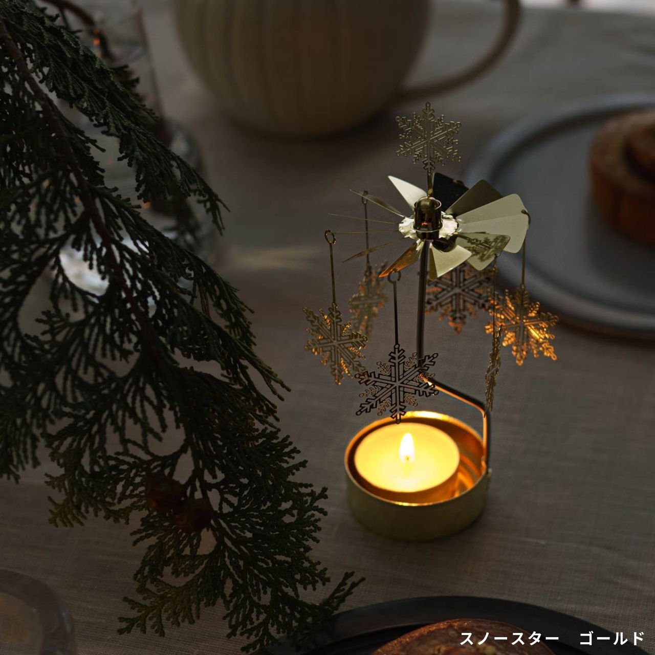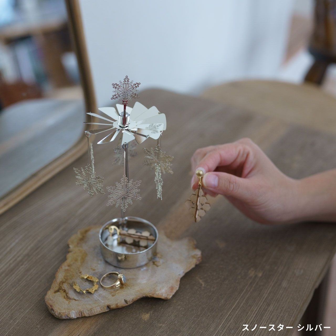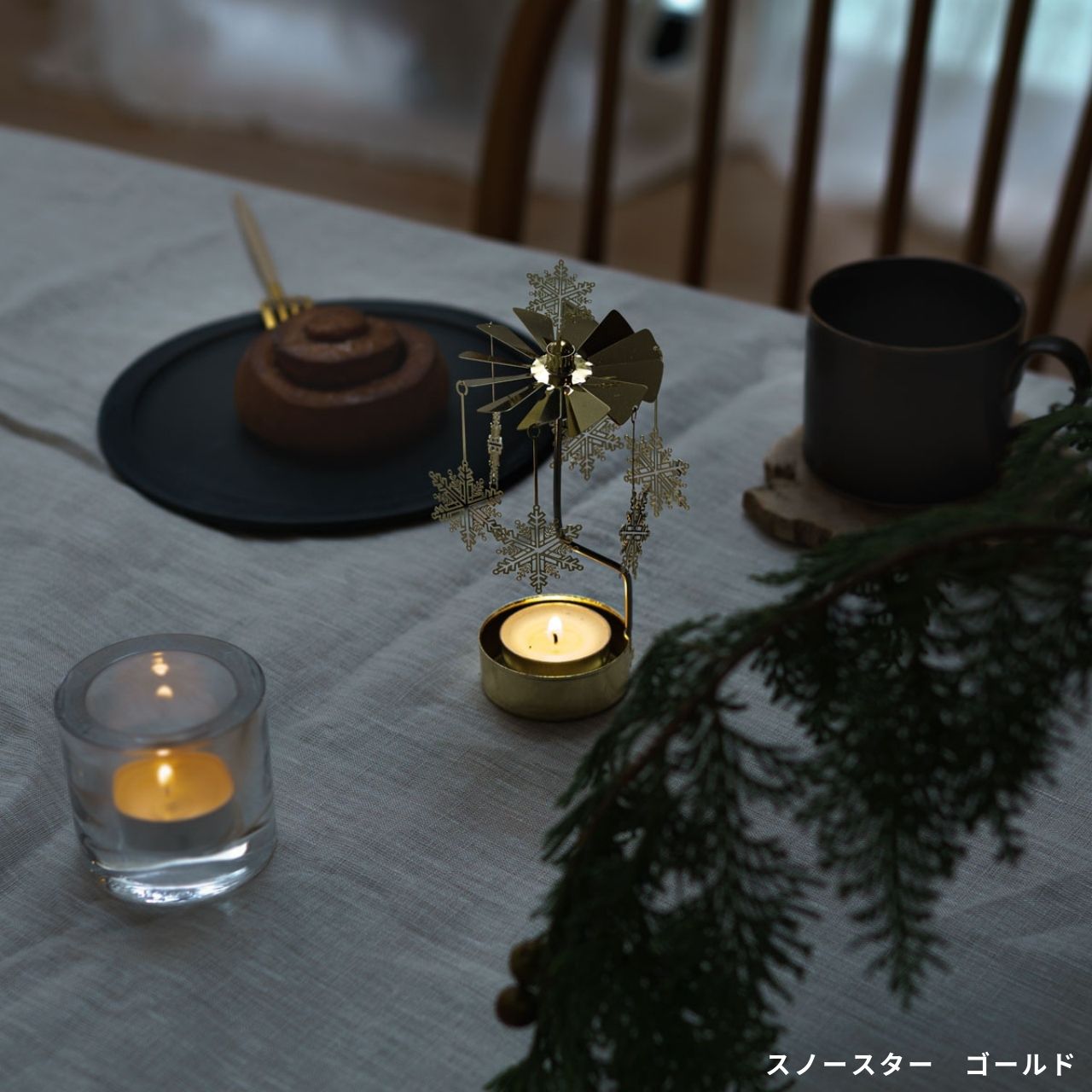スウェーデンの雑貨メーカー「PLUTO」のロータリーキャンドルホルダー。 キャンドルに温められた空気が上昇しオーナメントがまわりはじめます。 火を灯したばかりはゆっくり、温まってくると少しずつ回転に拍車がかかります。 炎の明かりとメタル素材が反射するキラキラはおうち時間にやさしくあたたかい雰囲気を運びます。 火を灯さなくても窓辺に置いておけば風を受けて回転します。 表情を変えるキャンドルホルダーをゆったり眺めてお楽しみください。