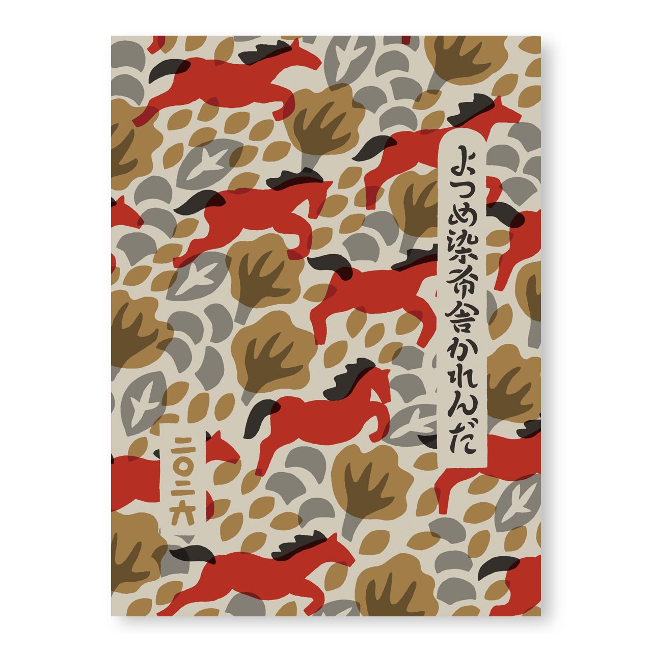 「表紙のデザインは2026年の干支にちなんで馬の柄を描いてみた。野生の馬たちが森や草原を駆け抜けるイメージ。前に住んでいた国東など人生の大半を田舎で過ごしているのだが、まあ色々な野生動物に出くわす。鹿、猪、野うさぎ、猿、キジなど挙げればきりがない。しかし野生の馬だけは日常の中で出くわすことはなかった。宮崎の都井岬で野生の馬を観に行ったがそれはそれは幻想的であった。その現実離れした存在感を表現したかった。」(小野さん) |