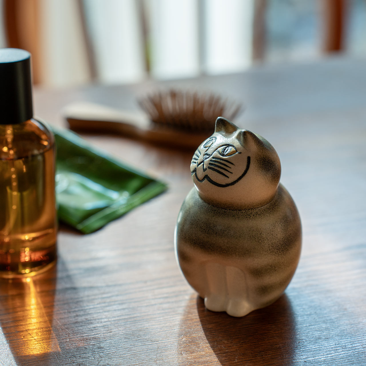 次回入荷分より値上げを予定しております。 たいへん恐れ入りますが、ご理解のほどよろしくお願いいたします。 ![]() ずっとほしかった。わたしだけのMIA憧れのあの子、スウェーデン生まれの猫のMIA(ミア)。ひと目見て、不思議な存在感と愛らしさに心うばわれたけど うちには動き回る猫もいるし…と考えて一旦諦めた。 それでもやっぱり気になる気持ちは抑えられず、 えいっと気合いをいれてお迎えしました。 猫の置物なんて置く場所あるの?って家族には言われたけど あれ?思いのほかいろんなところに置きやすい。 周りと調和するやわらかさのある絶妙なかたちも魅力なのです。 ![]() 何げない空間にそっとおいてみる。 こっちを見ているような、見ていないような。 ちょっぴりふてぶてしいような愛嬌のある表情を眺めていると 心がほっこりまあるくなる気分。 そこにいてくれるだけで肩のちからがふわっと緩まる Lisa LarsonのMIAはまさにそんな猫のオブジェ。 何でもないようで、かけがえのない幸せな時間が流れてる。 MIAがいるだけでなんだかうれしい毎日が始まります。 MIAのいるくらし![]() どこに置こうかな…と迷ってしまうかもしれませんが、落ち着いた色合いなのでどんなテイストのインテリアにもマッチするのです。小ぶりサイズが愛らしいMIA スモールはちょっとしたスペースに置きやすいのもうれしい。 ![]() 手のひらに収まるサイズなので玄関の棚に飾ってもよし。帰ってきたときにドアを開けると「おかえり」と言って出迎えてくれてるみたい。スウェーデン生まれのMIAだけど、不思議と和風のインテリアにも馴染みます。 ![]() 小さいお子さんや動物がいるから陶器は少し心配…という方もいらっしゃるかもしれません。まだまだ遊ぶことが大好きで動き回る猫と暮らしている我が家では、上下左右を囲まれた棚の中をMIAの定位置に。本を手に取るときにちらっと目が合うような感じもまた楽しい。 ![]() ちょこんと揃えた前足が愛らしい猫たちを眺めているだけで心和むような、ほっと心癒やされるような。横から見ても後ろ姿も愛らしく、全方向から眺めていたい猫たちです。 それぞれ違った表情が愛らしいたくさん作られているMIAだけど、ひとつひとつよく見ると焼色の濃淡、目や口元の表情も違っていてとても個性豊か。なんだかうちの猫もそうだったよなあ、って微笑ましくなってしまうようなところもMIAの魅力なのかも。どのMIAも愛嬌があるけど、あなただけのお気に入りの子に出会ってほしいから、くらすかたちでは個体を選んで購入いただけます。 ![]() 開けるときのわくわく感を楽しんで![]() 同じものは二つとないMIAを大切にお届けしたいから、ひとつひとつエアパッキンでくるんで紙ボックスに入れてお届けいたします。包装紙をかけてリボンを結び、汚れないようにOPPフィルム袋でお包みしたギフトラッピング仕様なので、ご自身のご褒美としても、大切なあの人への贈り物にもおすすめです。 ひとつひとつ違う表情だから、